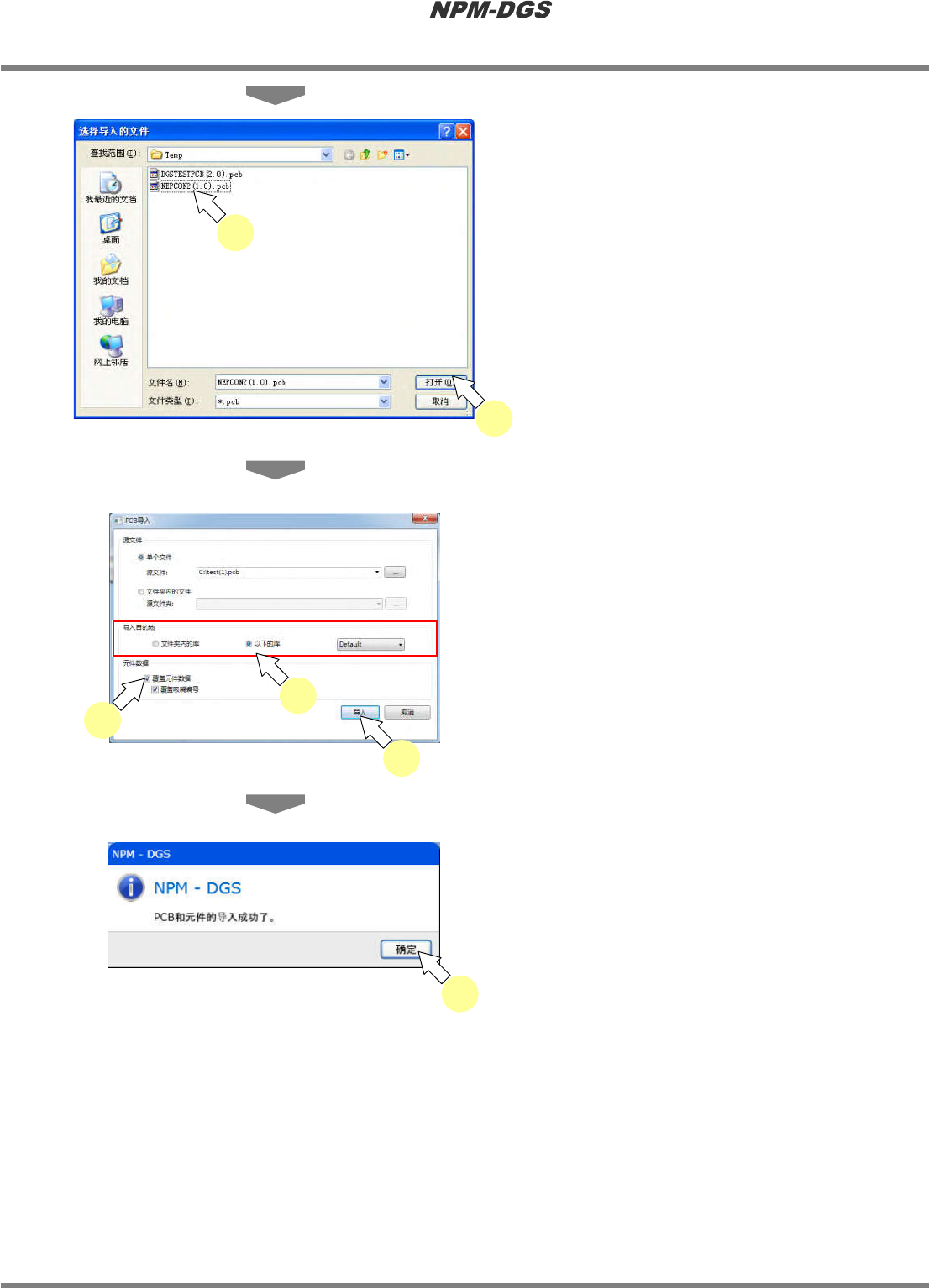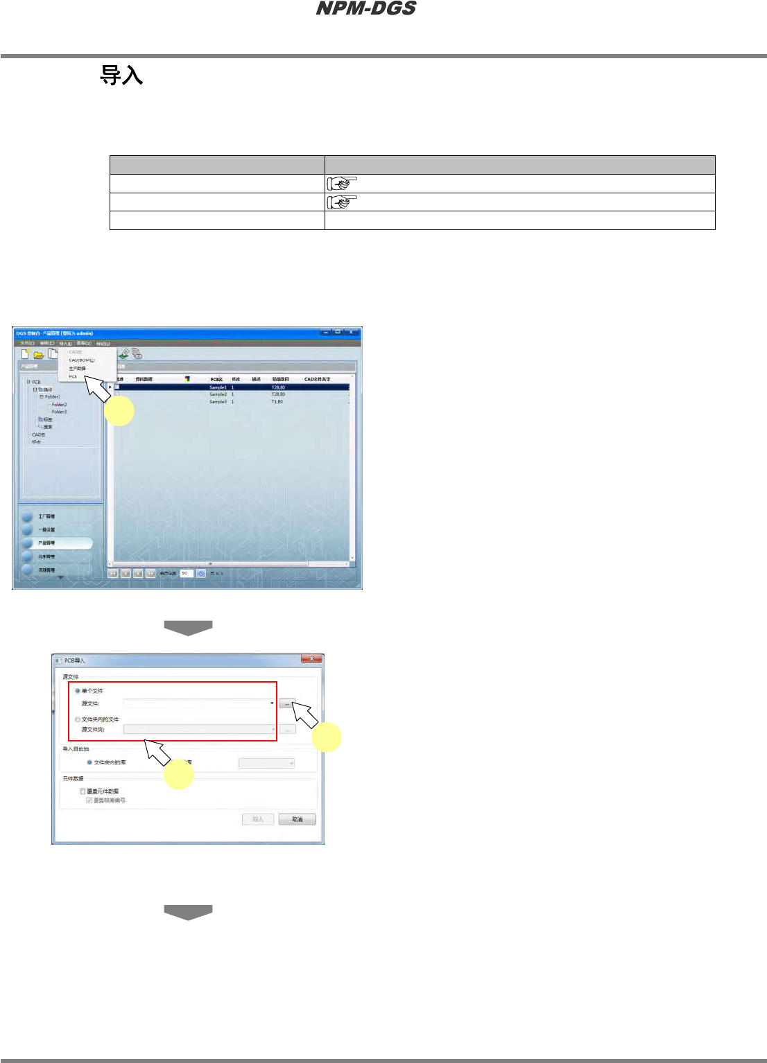 程序手册 5.1 概要 Page 5-16 EJS9AC-MB-05P-20 5.1.11 n 关于导入 存在三种导入 : CAD/BOM 文件、生产数据、 PCB 文件的导入。 导入 详细 CAD/BOM 文件 ‘5.3 CAD/BOM 文件的导入 ’ 生产数据 ‘5.6 生产数据的 PCB 导入 ’ PCB 文件 说明参见下述记载。 n PCB 导入的实施 当在 PCB 文件中包含元件数据时,将会连同元件 数据一 同导入。 1 选择…