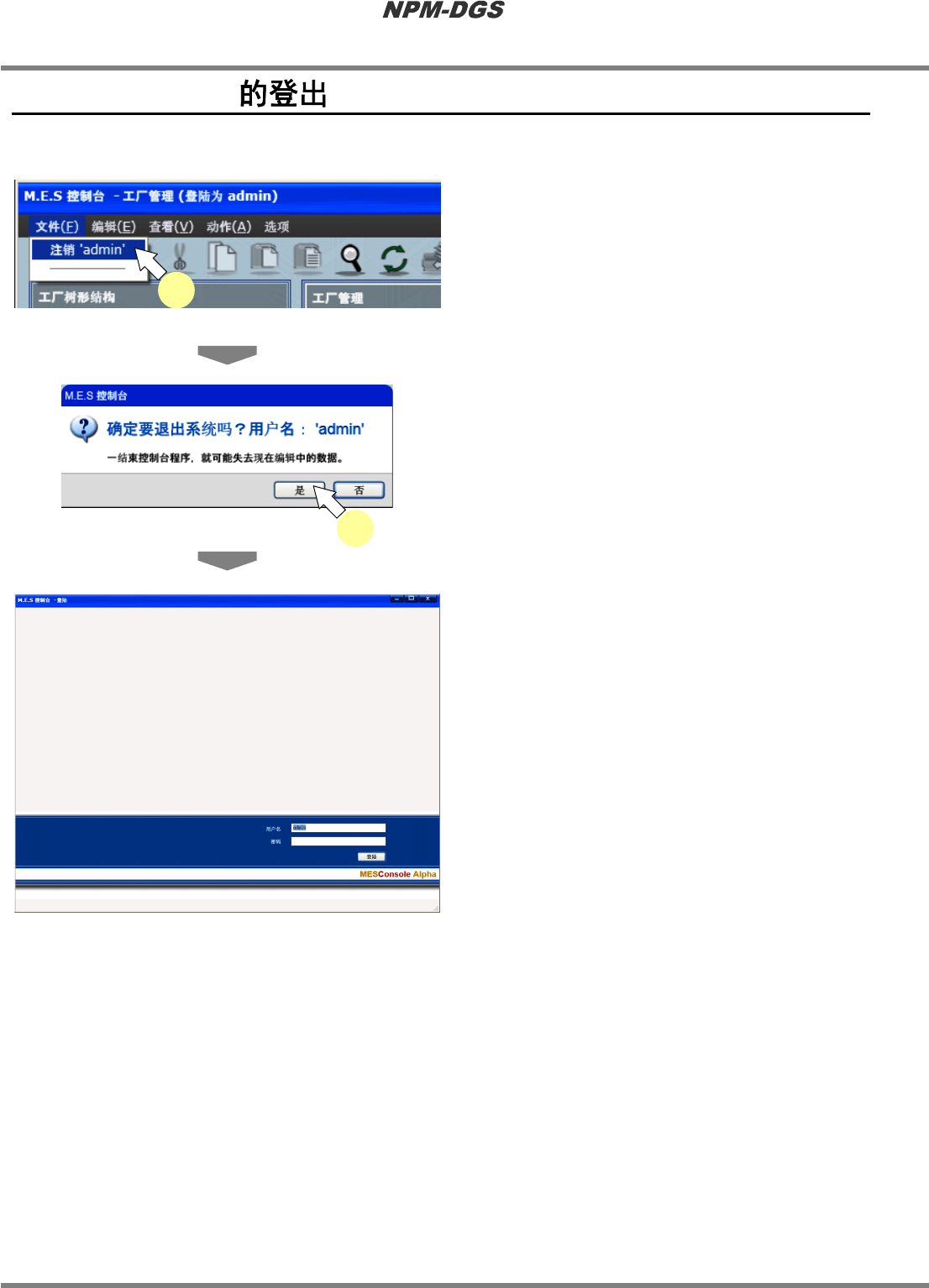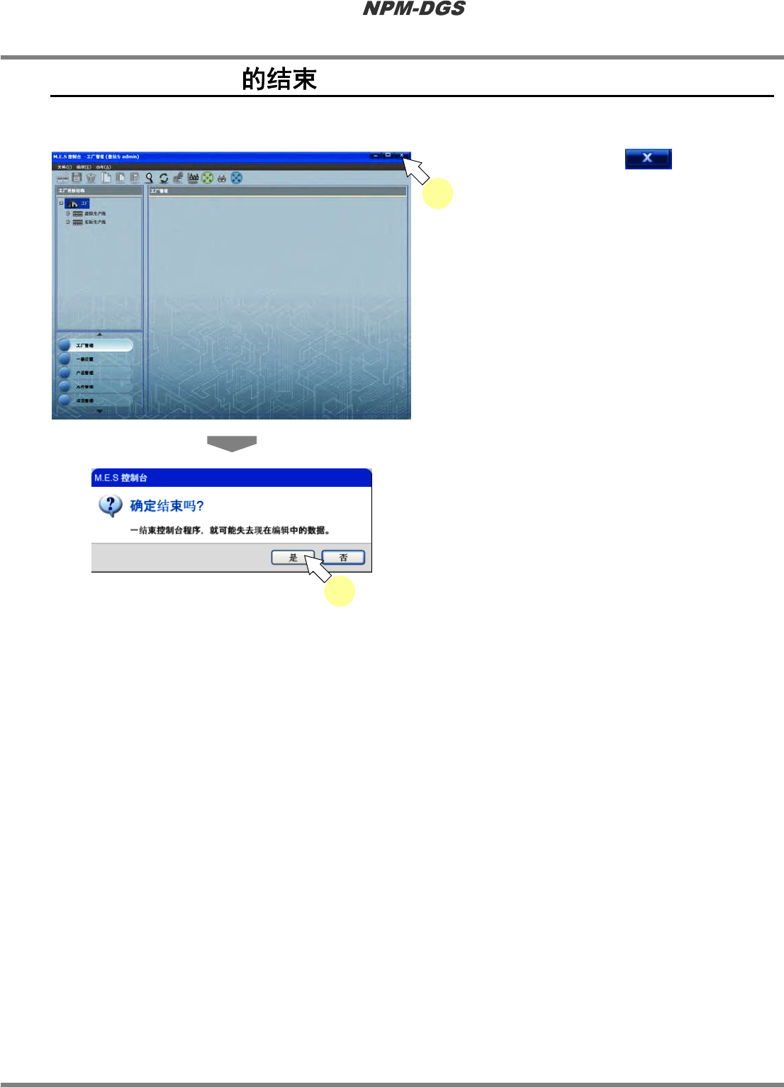 程序手册 1.4 NPM-DGS 的登出 Page 1-16 EJS9AC-MB-01P-07 1.4 NPM-DGS 登出 DGS 。 1 銷选择菜单栏的 [ 文件 ] ® [ 注销 ] 。 · 显示出确认画面。 2 点击 [ 是 ] 。 · 显示出登出画面。 Other010400S-03C00 Other010400S-01C00 1 Other010400S-02C00 2