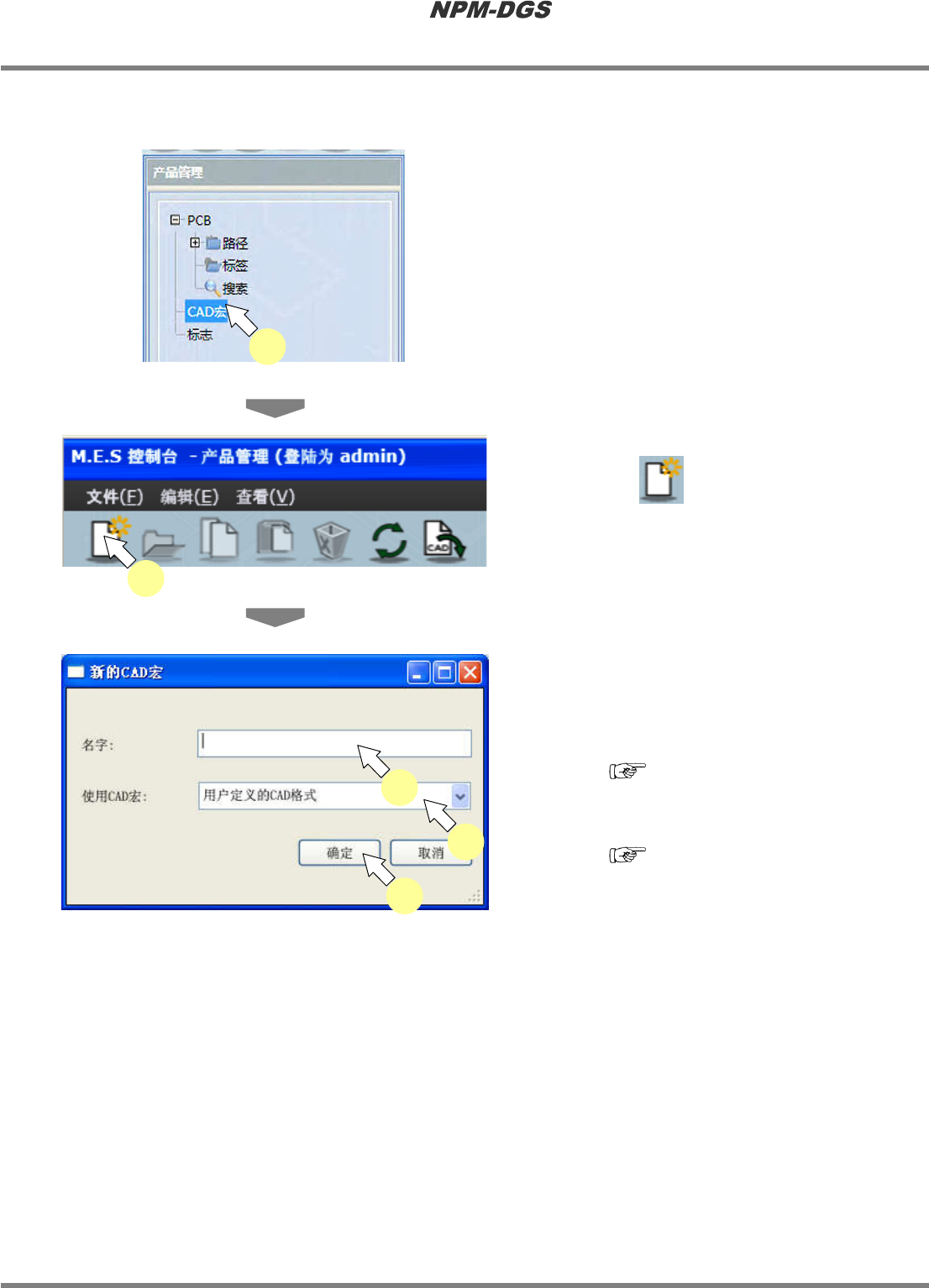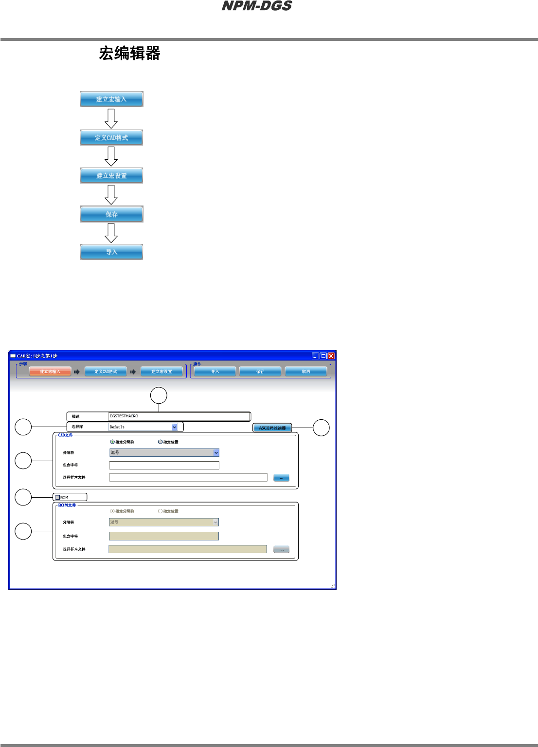 程序手册 5.2 CAD 宏的定义 Page 5-28 EJS9AC-MB-05P-20 5.2.1 CAD 编制、编辑宏时,请按照以下步骤。 ---------- 设定要导入的 CAD/BOM 文件。 ---------- 对 CAD/BOM 文件格式进行定义。 ---------- 对获取 CAD 时的具体设定进行定义 。 ---------- 保存所定义的宏文件。 ---------- 使用所定义的宏文件获取 CAD/BOM 文件…