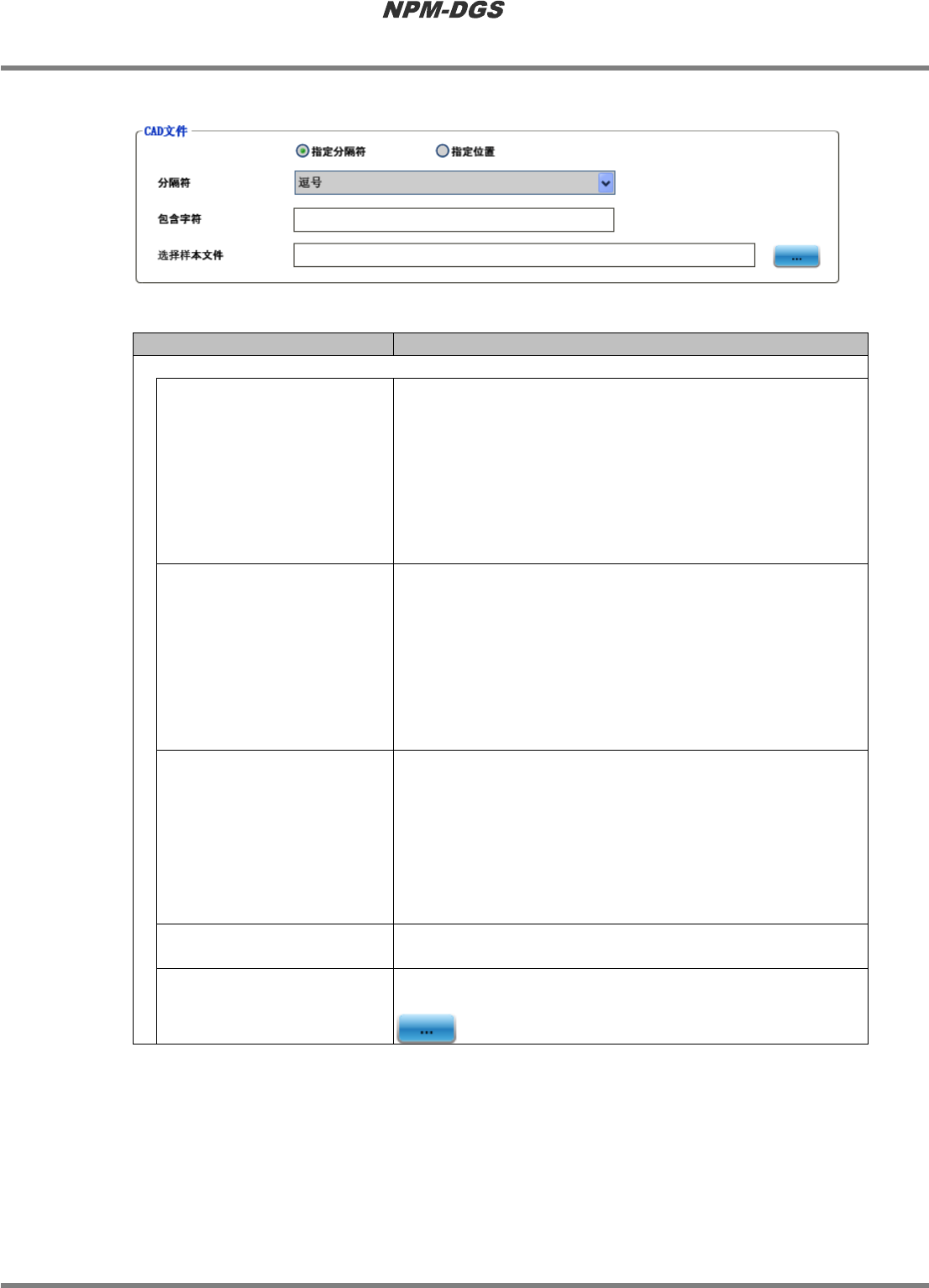 程序手册 5.2 CAD 宏的定义 Page 5-30 EJS9AC-MB-05P-20 ④ CAD 文件 n 设定项目 项目 说明 ‘CAD 文件 ’ ‘ 指定分隔符 ’ 将指定的字符作为分隔 符,将 CAD 数据分开到个别字段中。将 分开字段的字符输入到 ‘ 分隔符 ’ 栏中。 字段被引用符框住时, 用 ‘ 包 含字符 ’ 进行设定。另外, 在 ‘ 定义 CAD 格式 ’ 步骤的 [CAD] 标签中 可输入多个字段的位置 。 1…