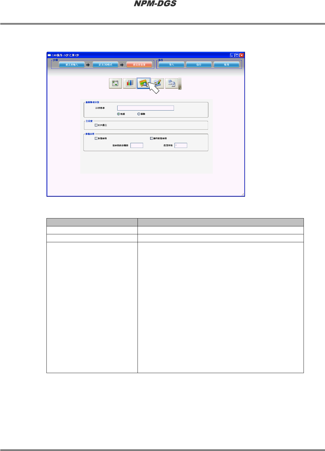 程序手册 5.2 CAD 宏的定义 Page 5-66 EJS9AC-MB-05P-20 n BOM 设定标签 进行 CAD 文件和 BOM (Bill of Materials: 元件表 ) 文件的核对。 n 设定项目 项目 说明 ‘ID 字符串 ’ 指定使用于基板修正识 别的字符串。 ‘ 包括 ’/‘ 排除 ’ 指定是否将识别用字符 包含在基板修正识别中。 ‘BOM 是主 ’ 无视在 BOM 文件里没有, 仅在 CAD 文件里存在的…