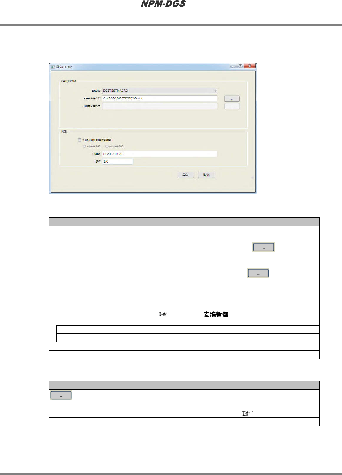 程序手册 5.2 CAD 宏的定义 Page 5-72 EJS9AC-MB-05P-20 4. 导入 打开导入标签,使用目前编辑中的宏 文 件获取 CAD 和 BOM 文件。 n 设定项目 项目 说明 ‘ 宏 ’ 显示已定义的宏文件。 ‘CAD 文件名字 ’ 指定 CAD 文件的路径。在默认设定时, 已被指定用于宏定义的 样本文件。点击 ‘CAD 文件名字 ’ 旁边的 ,将会显示文件 选择画面。 ‘BOM 文件名字 ’ 指定 BOM 文…