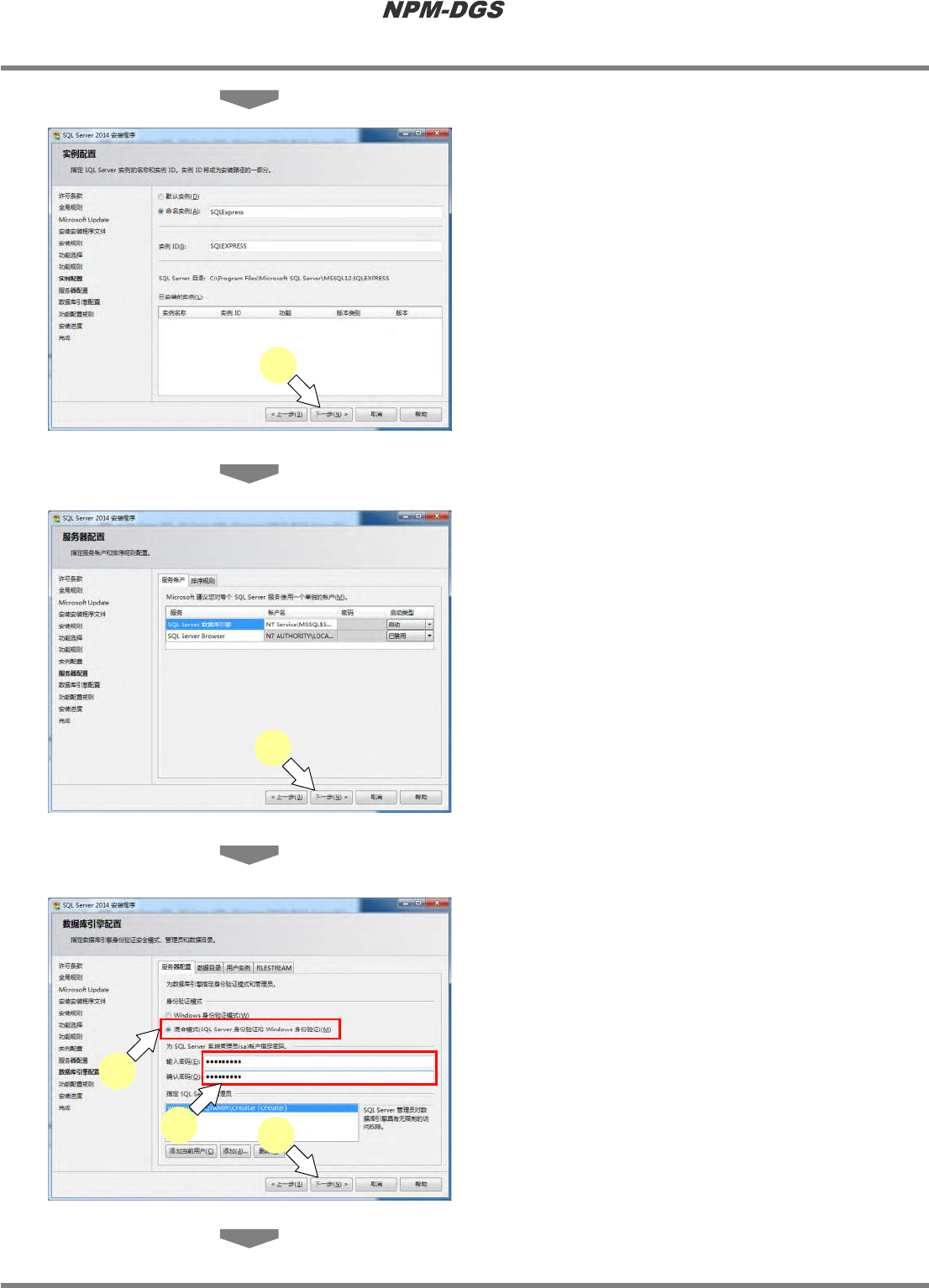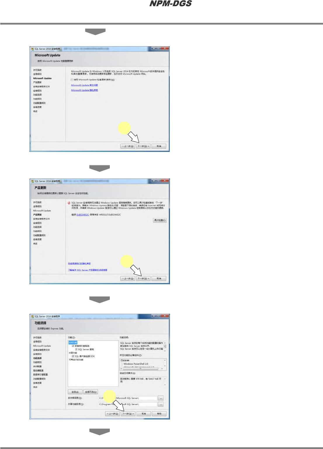 程序手册 2.1 NPM-DGS 的安装 EJS9AC-MB-02P-12 Page 2-7 ( 没有连接网络时 ) 5 点击 [ 下一步 ] 。 · 没有连接网络时,勾选 ‘ 使用 Microsoft Update 检查更新 ( 推荐 ) ’后,点击 [ 下一步 ] 。 6 点击 [ 下一步 ] 。 · 只有在没有连接网络的情形下显示这 个 画面。 ( 连接了网络时,不会显示 这 个画面。 ) 7 点击 [ 下一步 ] 。 Insta…