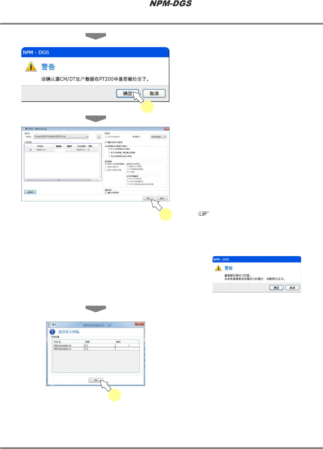 程序手册 5.6 生产数据的 PCB 导入 Page 5-116 EJS9AC-MB-05P-20 n PCB 导入的设定项目 项目 说明 文件名 显示所选择文件的名称 。 复选框 请选择执行导入的 PCB 。初期显示为选择了全部 PCB 的状态。 ‘PCB 名 ’ 显示要导入的 PCB 名称。 ‘ 基板面 ’ 显示导入的基板面。将 显示 [ 表面 ] 、 [ 背面 ] 中的某一项。 ‘ 数据库 ’ 显示要导入的 PCB 名称是否已存在…