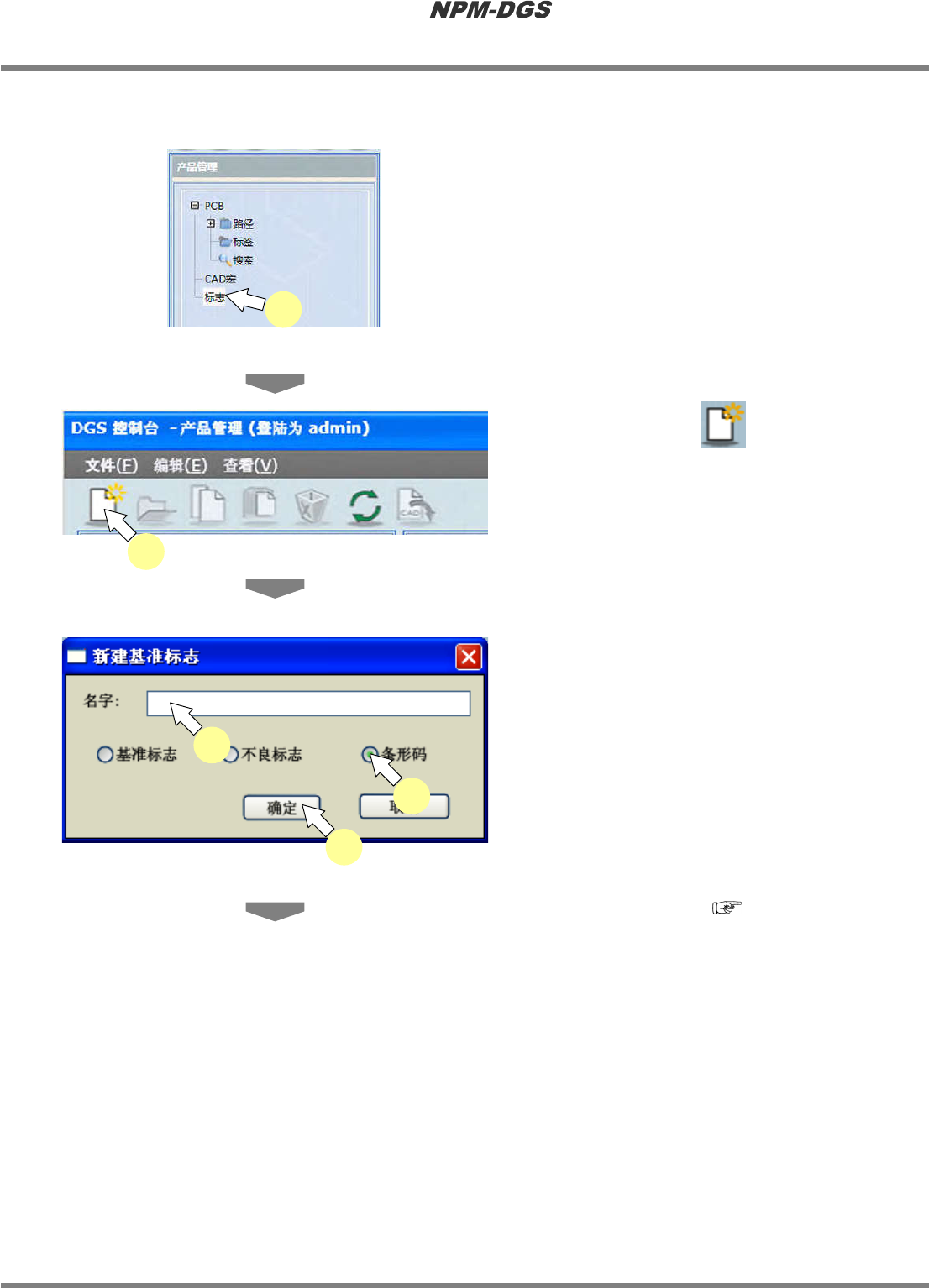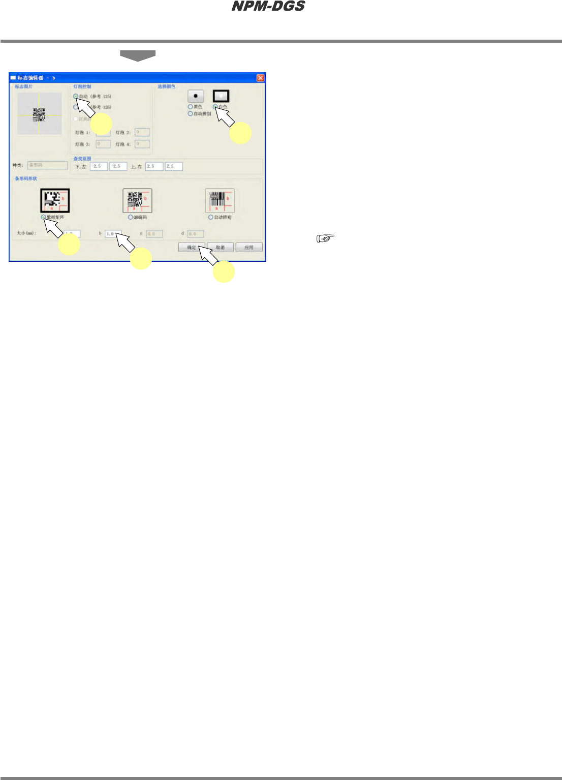 程序手册 5.7 标记的设定 Page 5-128 EJS9AC-MB-05P-20 6 在 ‘ 条形码形状 ’ 中选择形状。 7 在 ‘ 大小 ’ 栏里输入形状的大小。 8 在 ‘ 灯泡控制 ’ 中选择条形码的识别模 式。 * 选择手动时,请输入照 明值。在通常情况下, 照明值用设备进行示教 而决定。 ( 详细内容,请参照设备使用说明书。 ) 9 在 ‘ 选择颜色 ’ 中选择标记的颜色。 10 点击 [ 应用 ] 或者 [ 确定 ] …