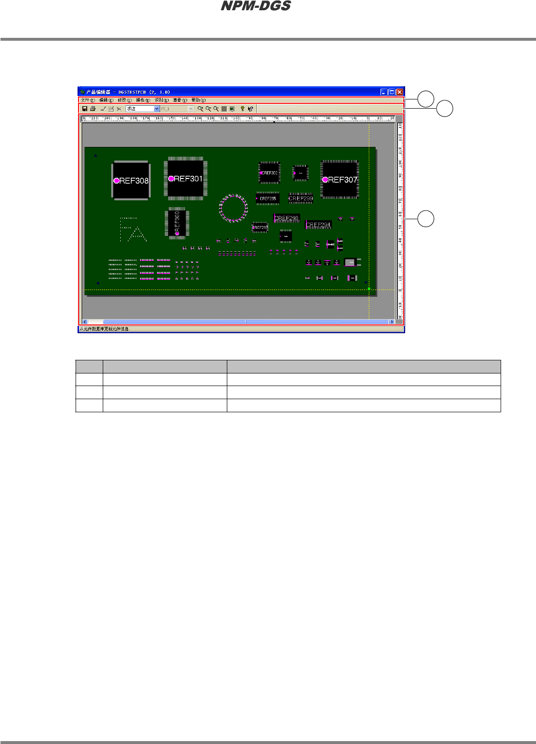 程序手册 5.8 PCB 编辑 Page 5-140 EJS9AC-MB-05P-20 n PCB 编辑器 No. 名称 说明 菜单栏 显示各菜单。 ‚ 工具栏 显示各操作的图标。 ƒ PCB 图像显示部。 显示 PCB 图像。 Project050800S-23C 00 2 1 2 2 2 3
