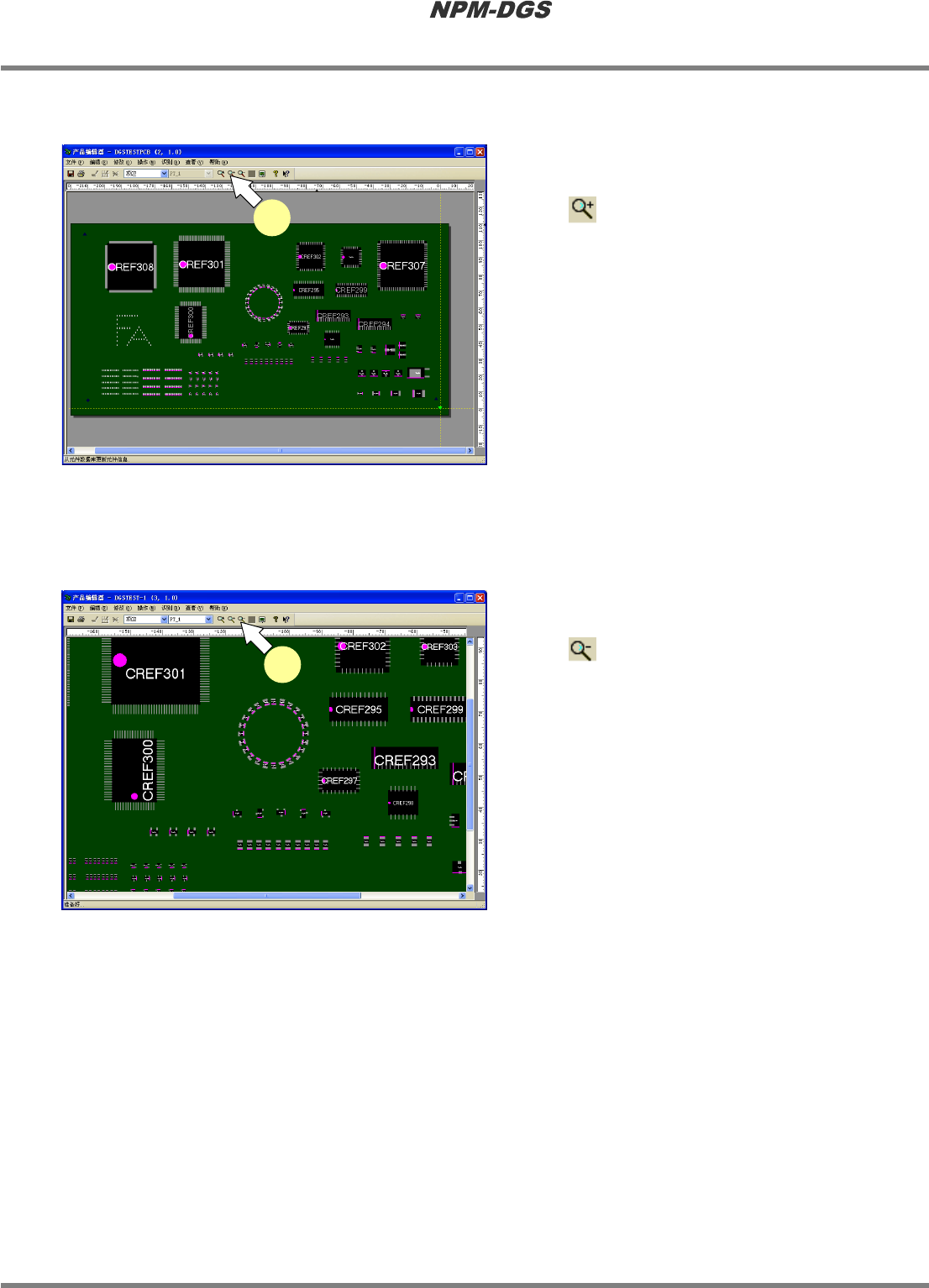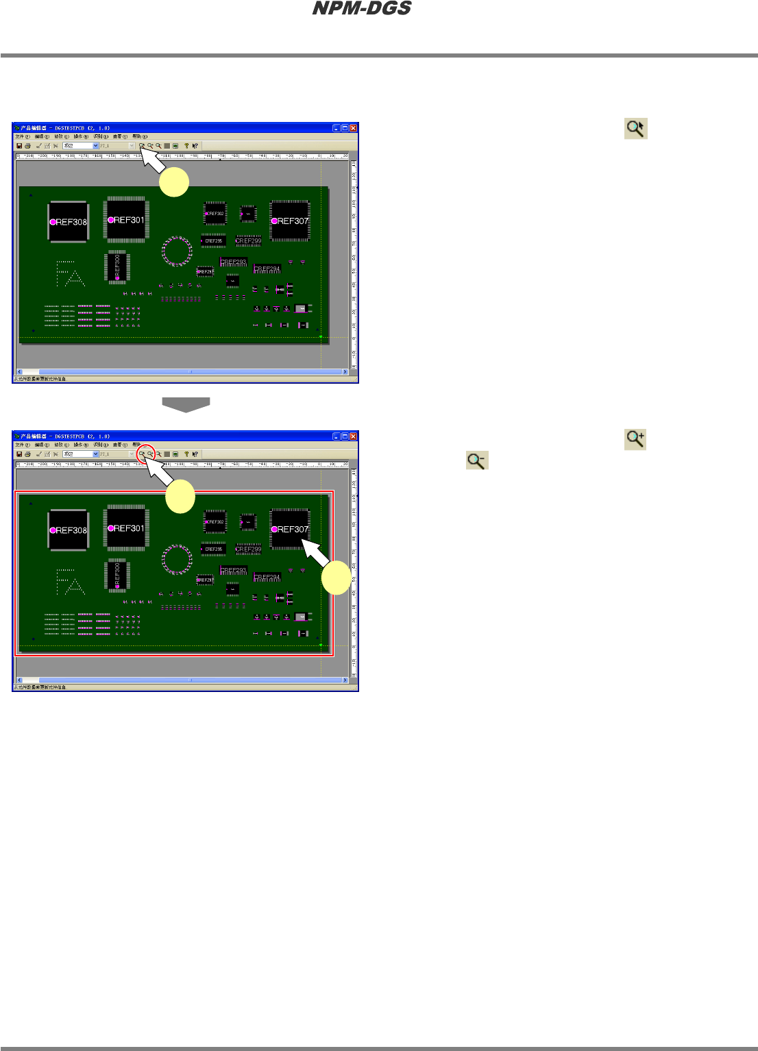 程序手册 5.8 PCB 编辑 EJS9AC-MB-05P-20 Page 5-153 n 基板图像的放大 1 在 PCB 编辑器上通过 [Ctrl] 键 + 鼠标 滚轮执行操作,或者点击工具栏上的 ( 放大 ) 。 · 将放大基板图像。 n 基板图像的缩小 1 在 PCB 编辑器上通过 [Ctrl] 键 + 鼠标 滚轮执行操作,或者点击工具栏上的 ( 缩小 ) 。 · 将缩小基板图像。 Project 050801S-03C00 1 …