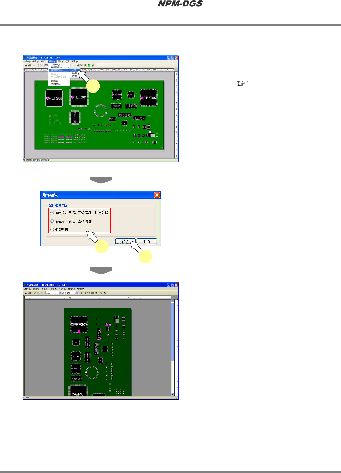 程序手册 5.8 PCB 编辑 Page 5-164 EJS9AC-MB-05P-20 n 正面一面取基板的转换 1 选择菜单栏的 [ 操作 ] ® [ 正面一面取基 板的转换 ] 。 * 为了防止实装点标示符 的重复,在环境设定下 设定了标示符重复检查 时,不能使用 ' 一面取转 换 ' 功能。 ' 3.2.3 DGS ' · 显示出将多面取基板转 换成一面取基板的图 像。 Project050…