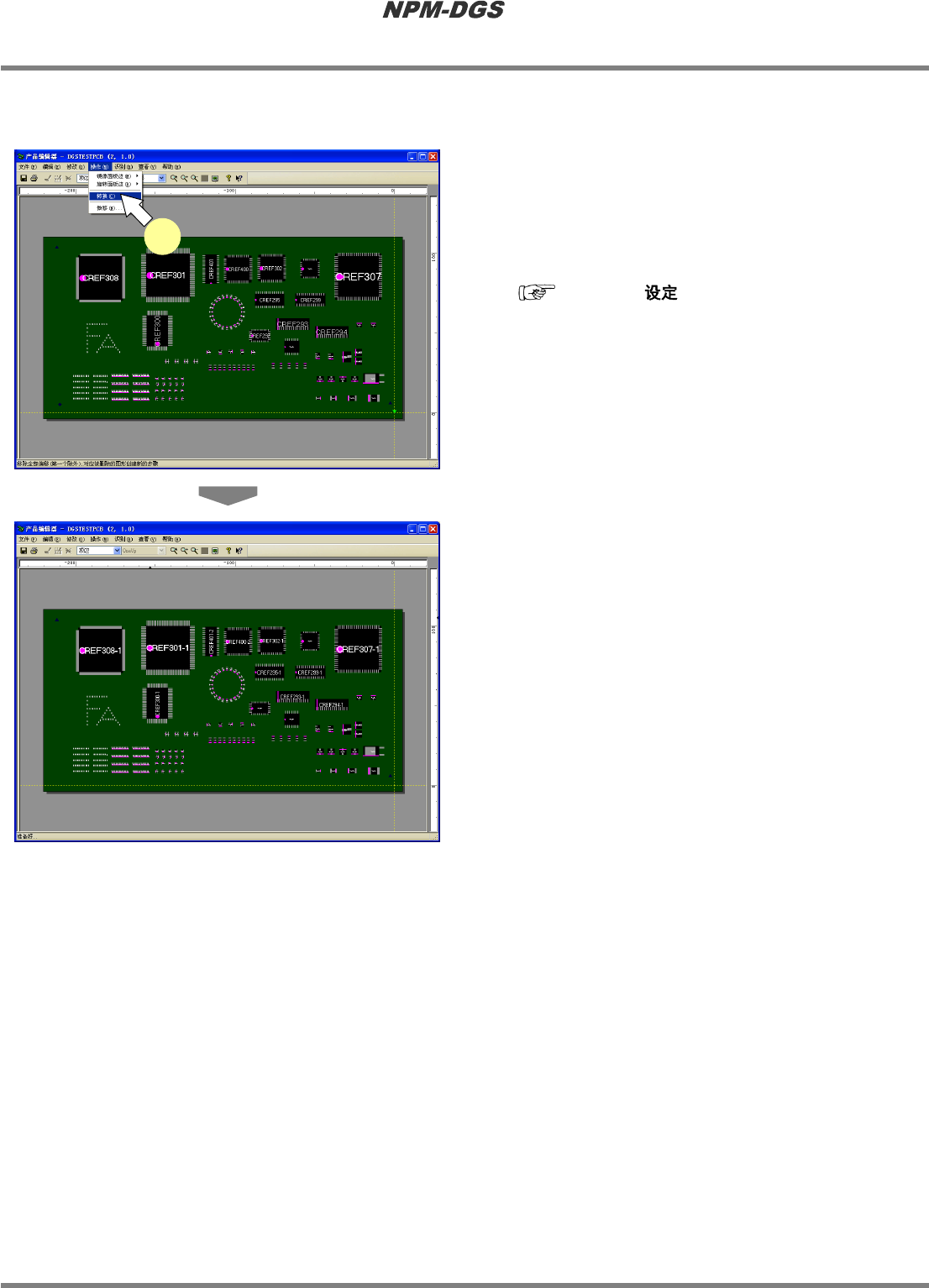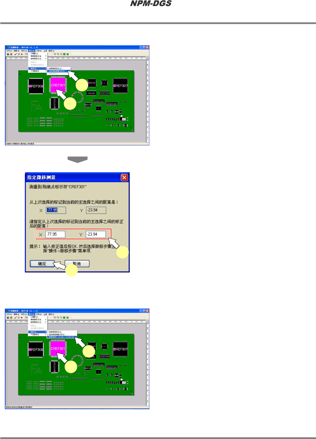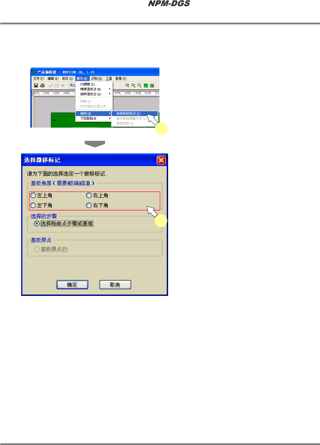 程序手册 5.8 PCB 编辑 EJS9AC-MB-05P-20 Page 5-165 n 位置的调整 ① 基准位置的选择 1 选择菜单栏的 [ 操作 ] ® [ 微移 ] ® [ 选择 微移标记 ] 。 · 显示出 < 选择微移标记 > 画面。 2 指定作为位置调整基准的位置。 * 在将 ‘ 选择的步骤 ’ 设为基准位置时,先在基板 上选择贴装点或标记后 , 再执行 [ 操作 ] ® [ 微移 ] ® [ 选择基准位置…