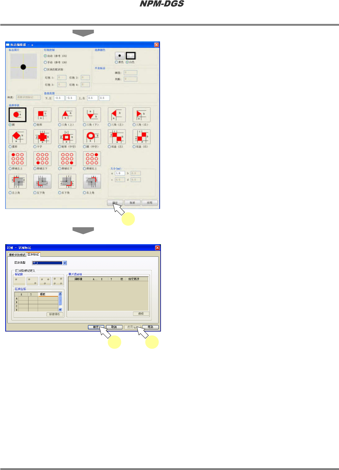 程序手册 5.8 PCB 编辑 EJS9AC-MB-05P-20 Page 5-181 8 对要编辑的地方进行必要的设定, 点击 [ 应用 ] 。 · 当存在使用相同模板标 记的区块偏移量时,显 示出确认对话框。 9 点击 [ 是 ] 或 [ 否 ] 。 [ 是 ] : 同时还将变更反映进其他区块偏移量 的 标记。 [ 否 ] : 只对所选择标记反映变更。 · 而且,当存在配置在相同基板面上, 且以 相同 模板编制的标记时, 将显示在步…