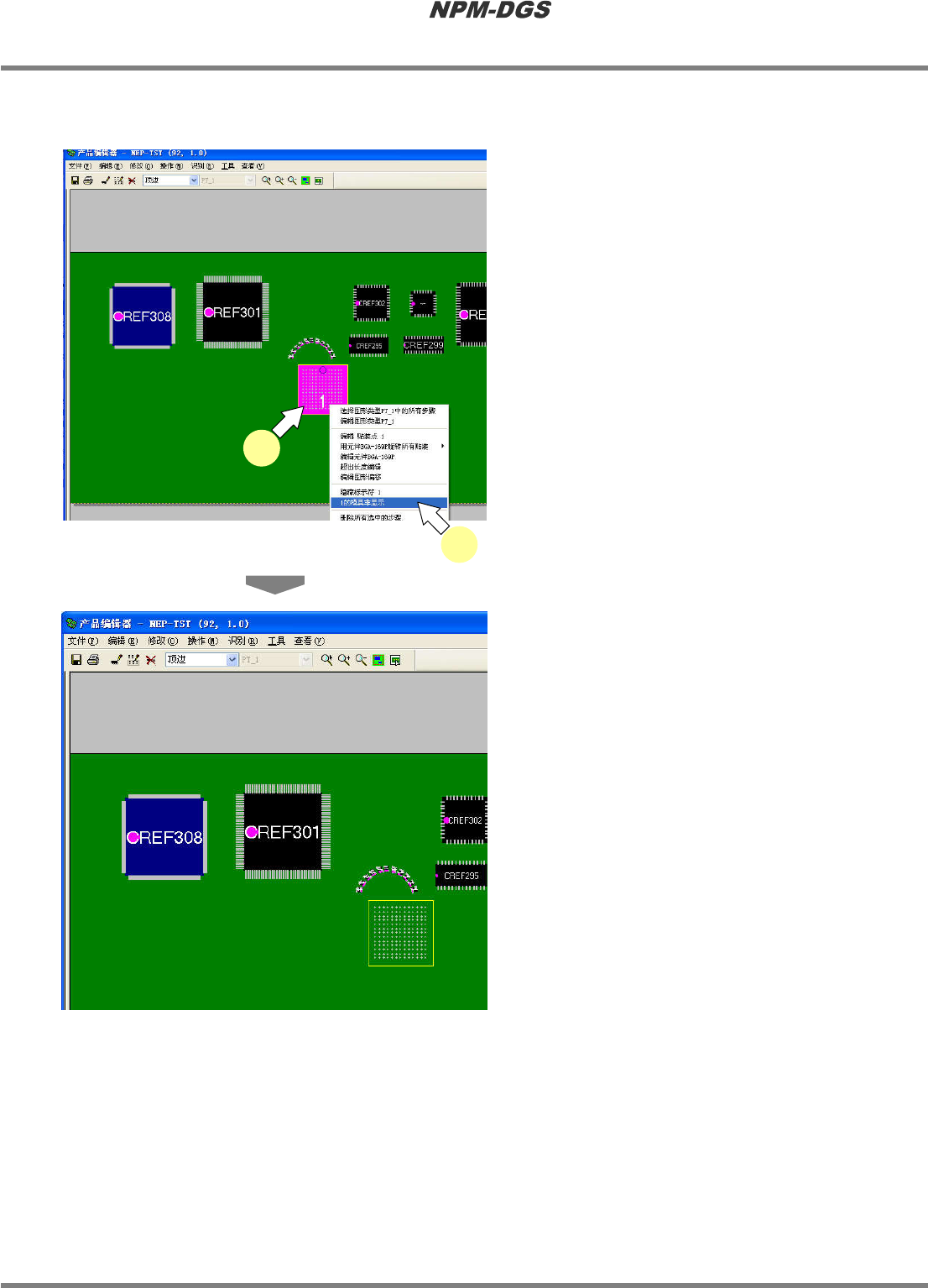 程序手册 5.8 PCB 编辑 EJS9AC-MB-05P-20 Page 5-247 n 不显示 / 显示 BGA 元件的模具 1 从 PCB 编辑器的 PCB 意象图中, 选择 需要隐藏的 BGA 元件。 2 在所选择的元件上, 从右击菜单中选择 [XXXX 的模具非显示 ] 。 · 在隐藏了 BGA 元件模具部的状态下, 针对这个 元件执行步骤 1 、 2 ,将显示隐藏的模具。 Project 050804S-39C01 Proj…