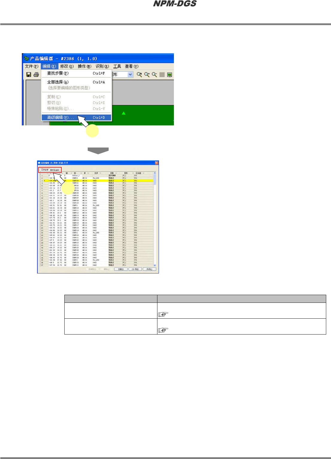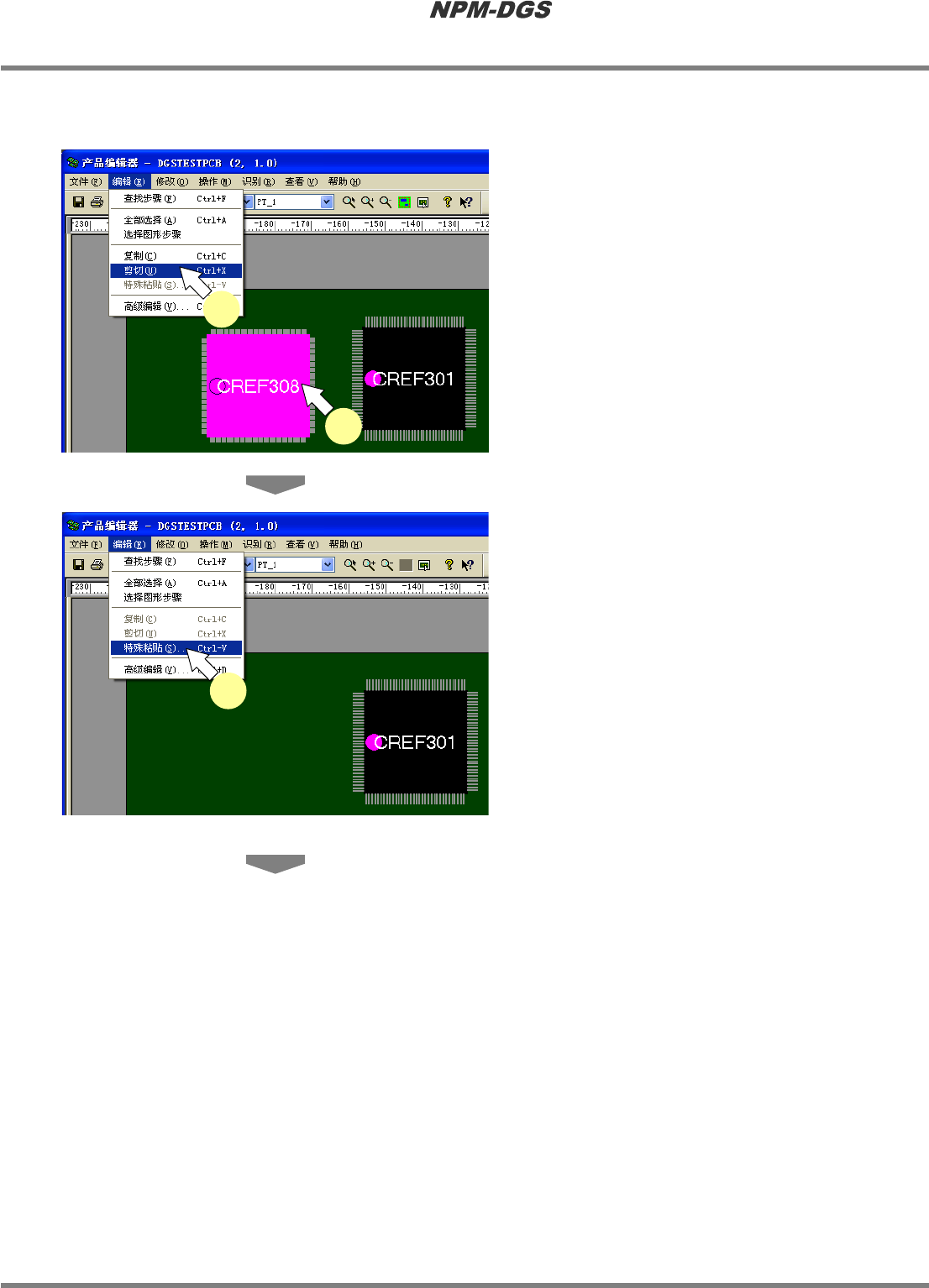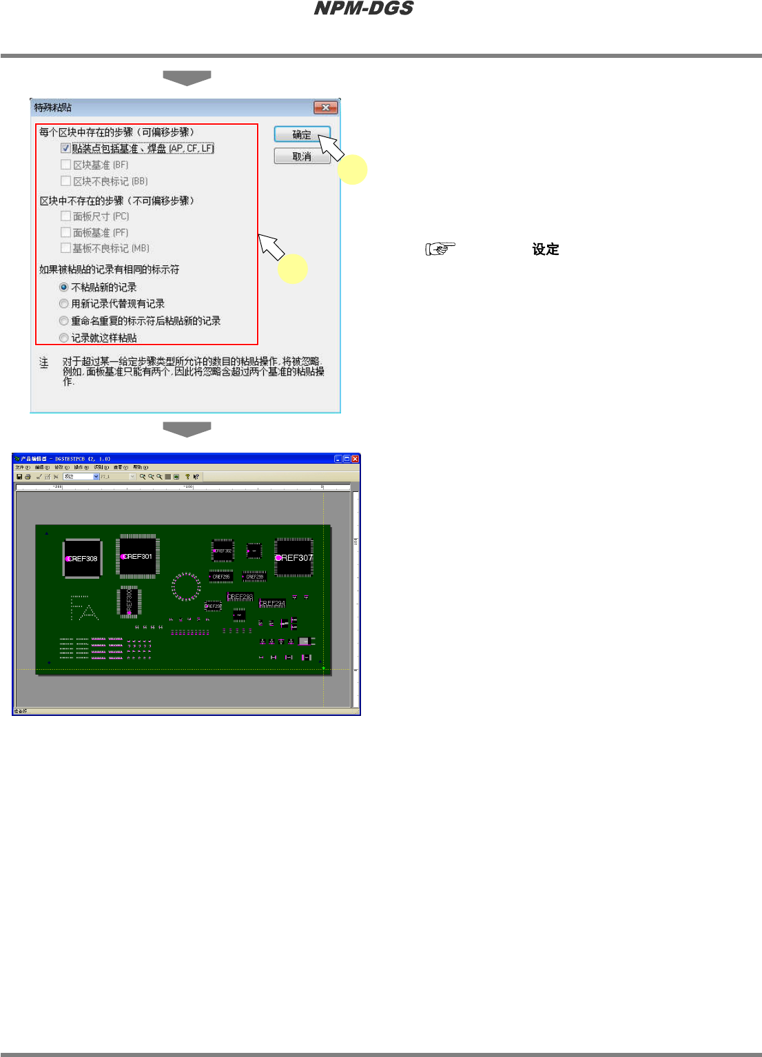 程序手册 5.8 PCB 编辑 Page 5-260 EJS9AC-MB-05P-20 4 进行必要的编辑。 5 点击 [ 确定 ] 。 为了防止贴装点标示符 的重复, 当在环境设定下 设定了标示符重复检查 时, 无法执行 ' 纪录就这样 粘贴 ' 的操作 ’ 。 ' 3.2.3 DGS ' · 粘贴所剪切的位置。 Project050804S-27C00 Project050804S-24C02…