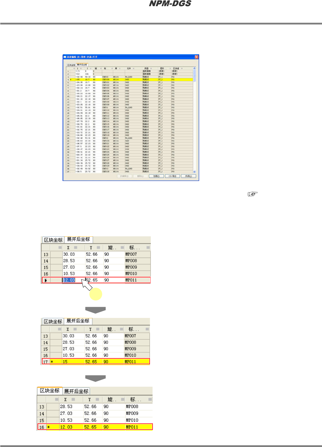 如果坐标变更为与展开后坐标不同的坐标,行的颜色转为黄色す。同时,