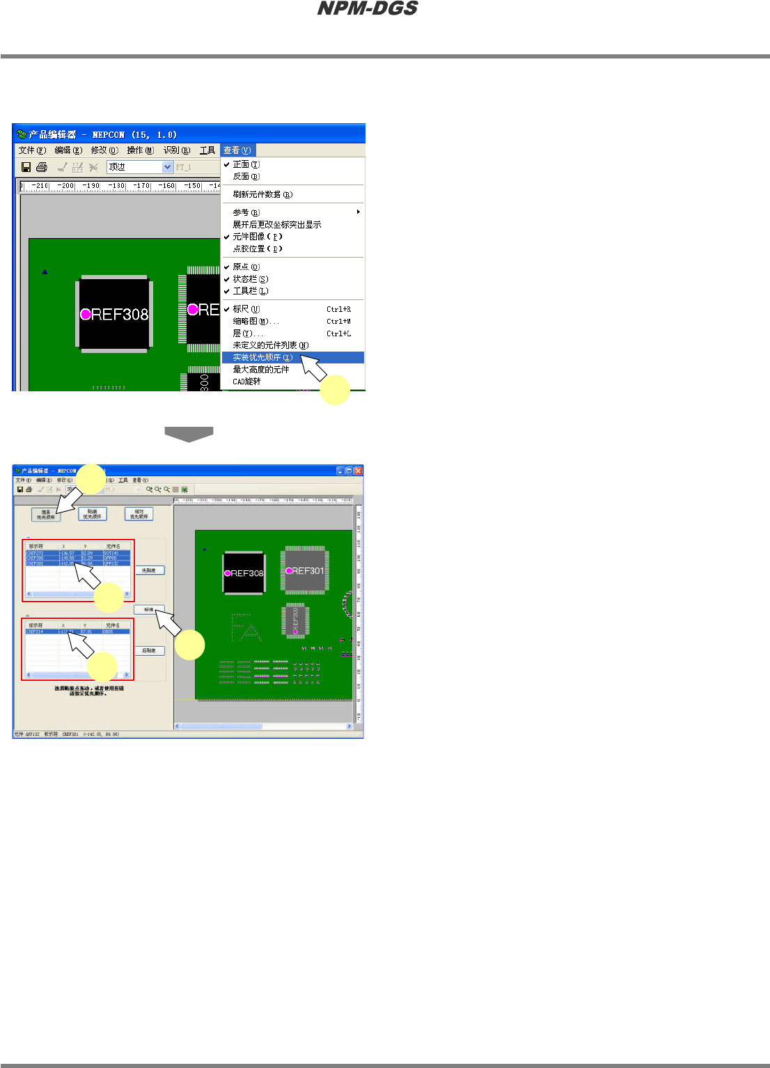 程序手册 5.8 PCB 编辑 Page 5-308 EJS9AC-MB-05P-20 n 简易优先顺序的删除 1 选择菜单栏的 [ 查看 ] ® [ 实装优先顺 序 ] 。 · 显示出实装优先顺序画 面。 · 上次使用时如果在显示 画面的状态下保存 PCB 编辑器, 即使不选择 [ 实装优先顺序 ] , 也会自动 显示出来。 2 点击 [ 简易优先顺序 ] 。 3 选择先装表 / 后装表中的所有元件。 4 点击 [ 标准 ] ,或者将…