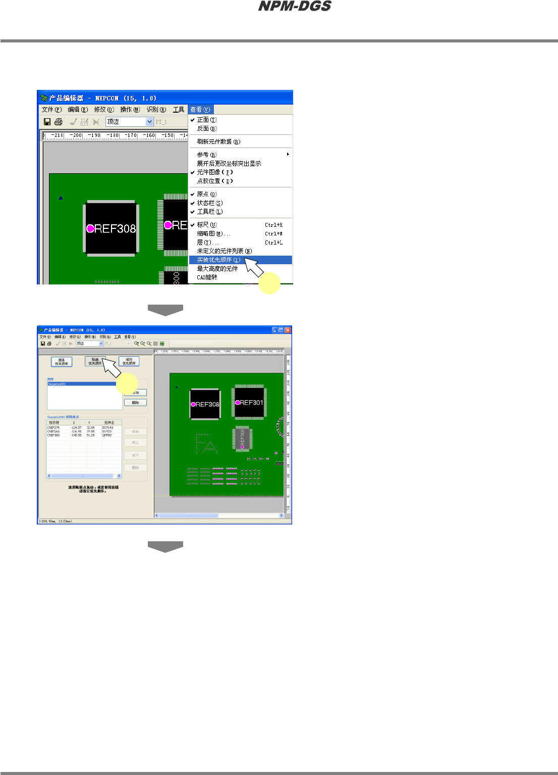 面元件后再贴装上面元件的生产数据。如果属于屏蔽盒,将会编制在贴装屏蔽盒之前先检查屏蔽盒