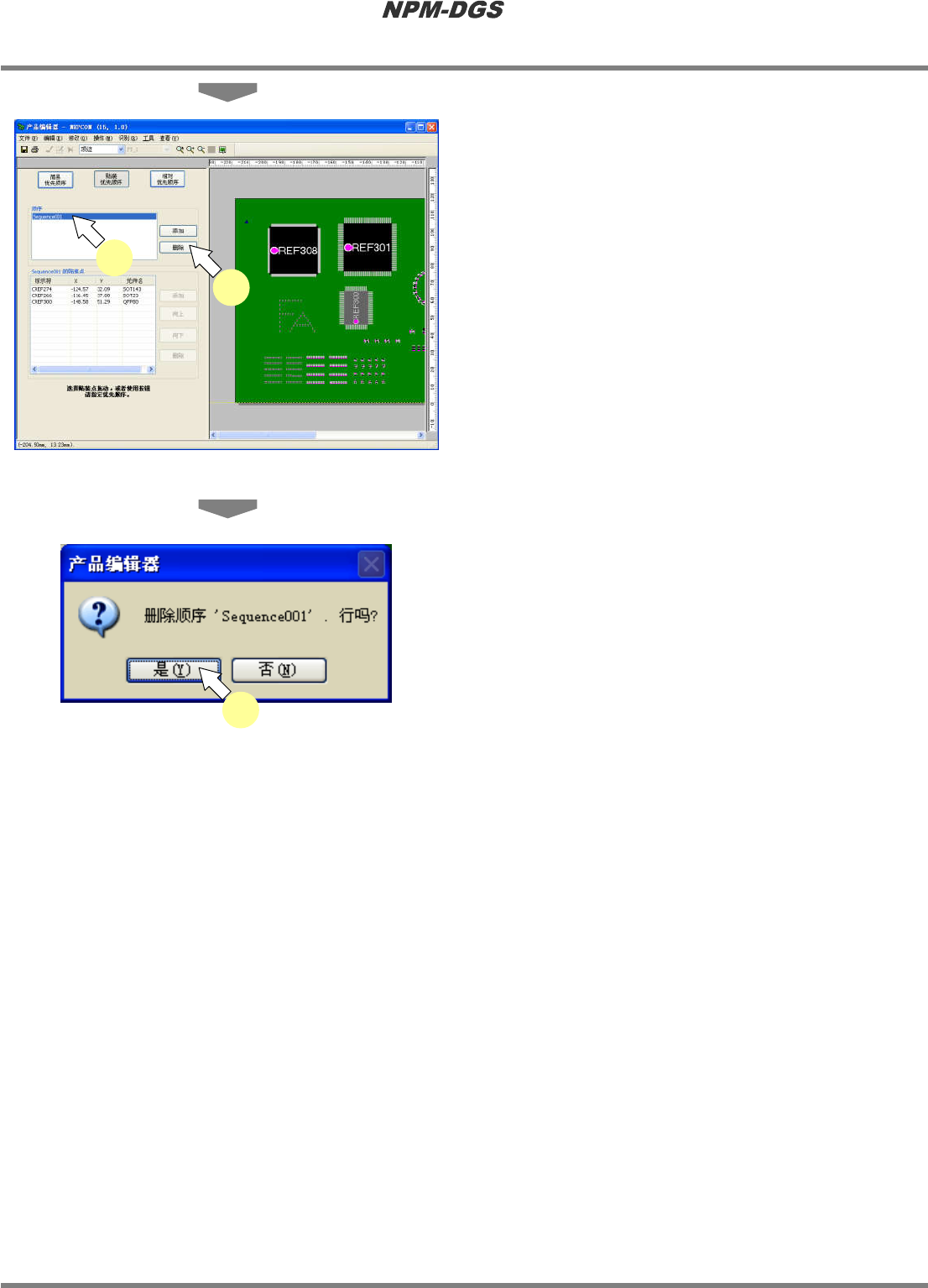 程序手册 5.8 PCB 编辑 Page 5-316 EJS9AC-MB-05P-20 3 在一览表中选择要删除的序列。 4 点击 [ 删除 ] 。 · 显示出确认画面。 5 点击 [ 是 ] 。 · 在序列一览表中所选的 序列将被删除。 Project050809S-20C02 3 4 Project 050809S-22C00 5
