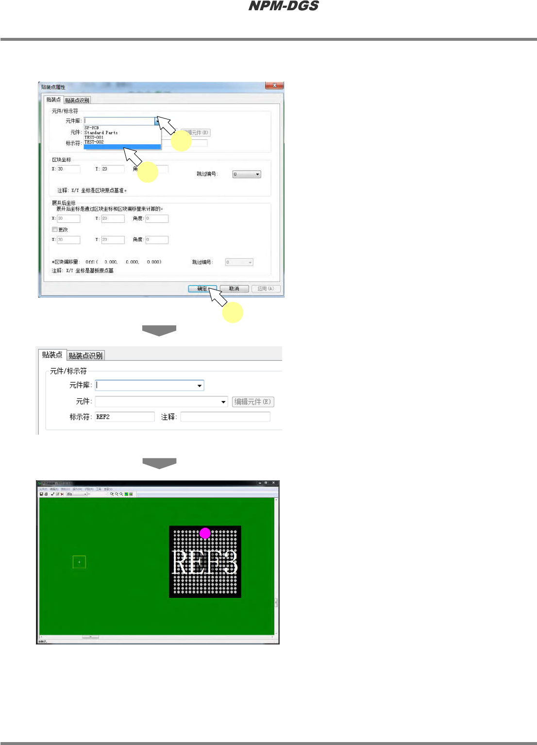 程序手册 5.8 PCB 编辑 Page 5-350 EJS9AC-MB-05P-20 n 预约实装点的显示 1 在产品编辑器的菜单上, 勾选 [ 查看 ] ® [ 预约实装点 ] 。 · 以黄色标记显示预约实 装点。 Project050819S-03C00 1 Project050819S-04C00