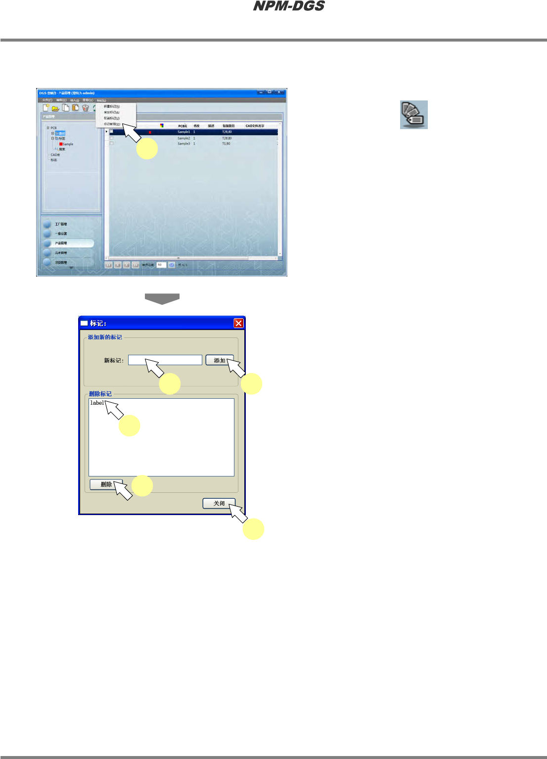 程序手册 5.9 PCB 搜索 EJS9AC-MB-05P-20 Page 5-359 n 标签管理 1 选择菜单栏的 [ 标记 ] ® [ 标记管理 ] ,或 者工具栏的 。 · 显示出 < 标记 > 画面。 2 添加新标签。 · 添加时,输入 ‘ 新标记 ’ ,然后点击 [ 添加 ] 。 3 删除标签。 · 删除时,在一览表中选 择标签,点击 [ 删除 ] 。 4 点击 [ 关闭 ] 。 · 关闭 < 标记 >…