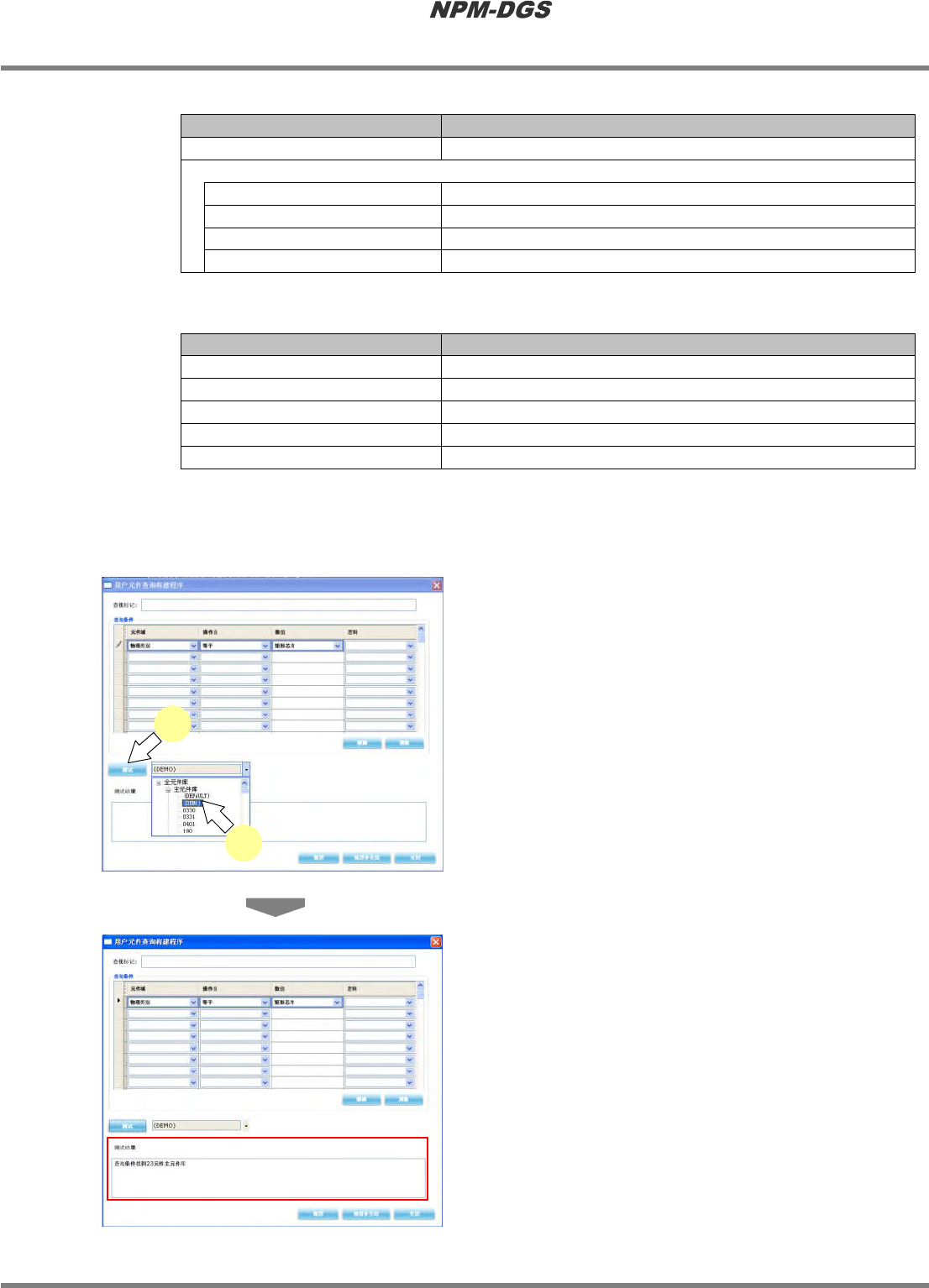 程序手册 6.3 元件检索 EJS9AC-MB-06P-18 Page 6-23 n 设定项目 项目 说明 ‘ 查找标记 ’ 输入检索条件名。 ‘ 查询条件 ’ ‘ 元件域 ’ 选择检索基准。 ‘ 演算子 ’ 选择检索基准和数值的条件。 ‘ 値 ’ 输入对于检索基准的数值。 ‘AND/OR’ 选择与其它检索条件的和 / 或。 n 按钮 按钮 说明 [ 移除 ] 清除所选择的行。 [ 清除 ] 清除所有的检索条件。 [ 保存 ] 保存检索…