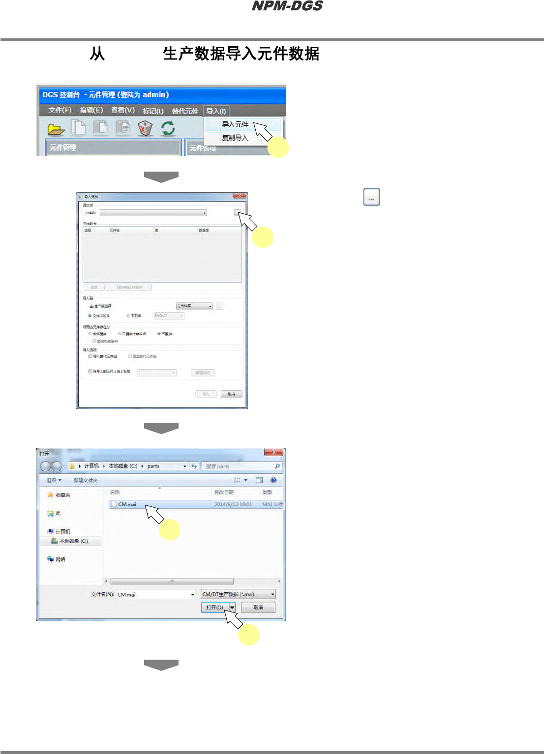 程序手册 6.4 元件的导入、导出 Page 6-36 EJS9AC-MB-06P-18 5 请确认源文件在 PT200 中是否进行数 据检查后,单击 [ 确定 ] 。 * 因为源文件不正常就不 能被正确导入,请务必 在 PT200 中进行数据检查。 6 选择导入地点。 * 属于 CM/DT 生产数据时, 导入目的地只为所指 定的主元件库。请从 ' 下列库 ' 中选择主元件库。 * 若要在导入的元件上贴 上标签,请在…