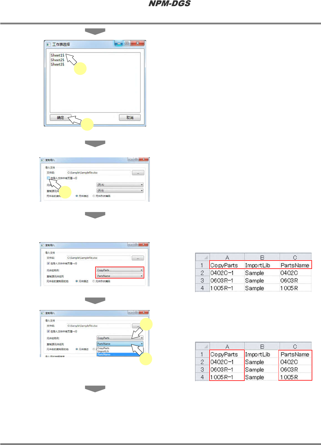 程序手册 6.4 元件的导入、导出 EJS9AC-MB-06P-18 Page 6-47 5 选择想要导入的工作表。 * 当 Excel 文件拥有多个工作 表时,显示选择工 作表的画面。 6 点击 [ 确定 ] 。 7 当文件存在页眉时, 勾选 ‘ 在导入文件中 有页眉一行 ’ 。 n 当选择了 ‘ 在导入文件中有页眉一行 ’ 时 · 将读取文件的打头行指 定为列名称。 8 对 ‘ 元件名称列 ’ 选择复制处的元件名称 列、对 ‘ 元件…