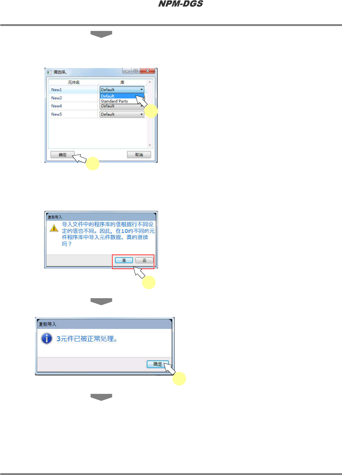 程序手册 6.4 元件的导入、导出 EJS9AC-MB-06P-18 Page 6-49 n 当在导入时存在多个复制源元件时 14 从 ‘ 元件程序库 ’ 的下拉菜单中选择用于 复制源的程序库后,点击 [ 确定 ] 。 n 当在导入中文件的程序库列中存在多个数据时 14 点击 [ 是 ]/[ 否 ] 。 [ 是 ] : 继续 导入 ,并以 选择 的程 序库列 编 制元件库。 [ 否 ] : 中断导入后返回到复制导入画面。 15 点击 […