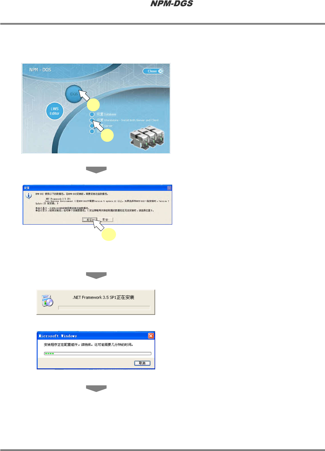 程序手册 2.1 NPM-DGS 的安装 EJS9AC-MB-02P-12 Page 2-39 ② DGS 的安装 n 在一台 PC 上安装 DGS 客户端、数据库、服务器的功能时 1 在放入 CD-ROM 后自动再生的画面上 选择 ‘DGS’ 的 ‘ 设置 Standalone - Install Both Server and Client’ 。 2 在设置确认对话框上选择 [ 是 ] 。 · 在下述 .NET 与 JRE 的版…