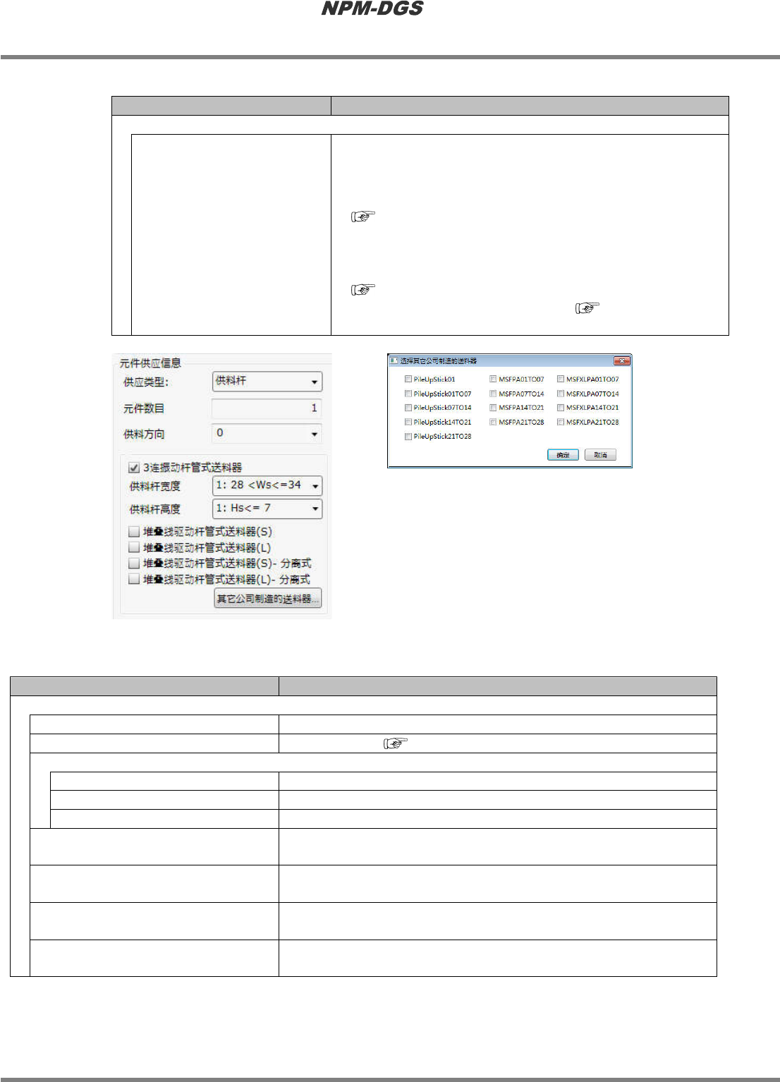 程序手册 6.5 添加新的元件 EJS9AC-MB-06P-18 Page 6-75 n 按钮 ( 仅在杆管式供给时显示 ) 项目 说明 [ 其他公司制造的送料器 ] 将显示其他公司制造送料器的选择画 面。可 设定多个其他公司制造的 送料器,但是混合使用杆管式送料器 和其他 公司制造的送料器时,最 多可使用 10 个。