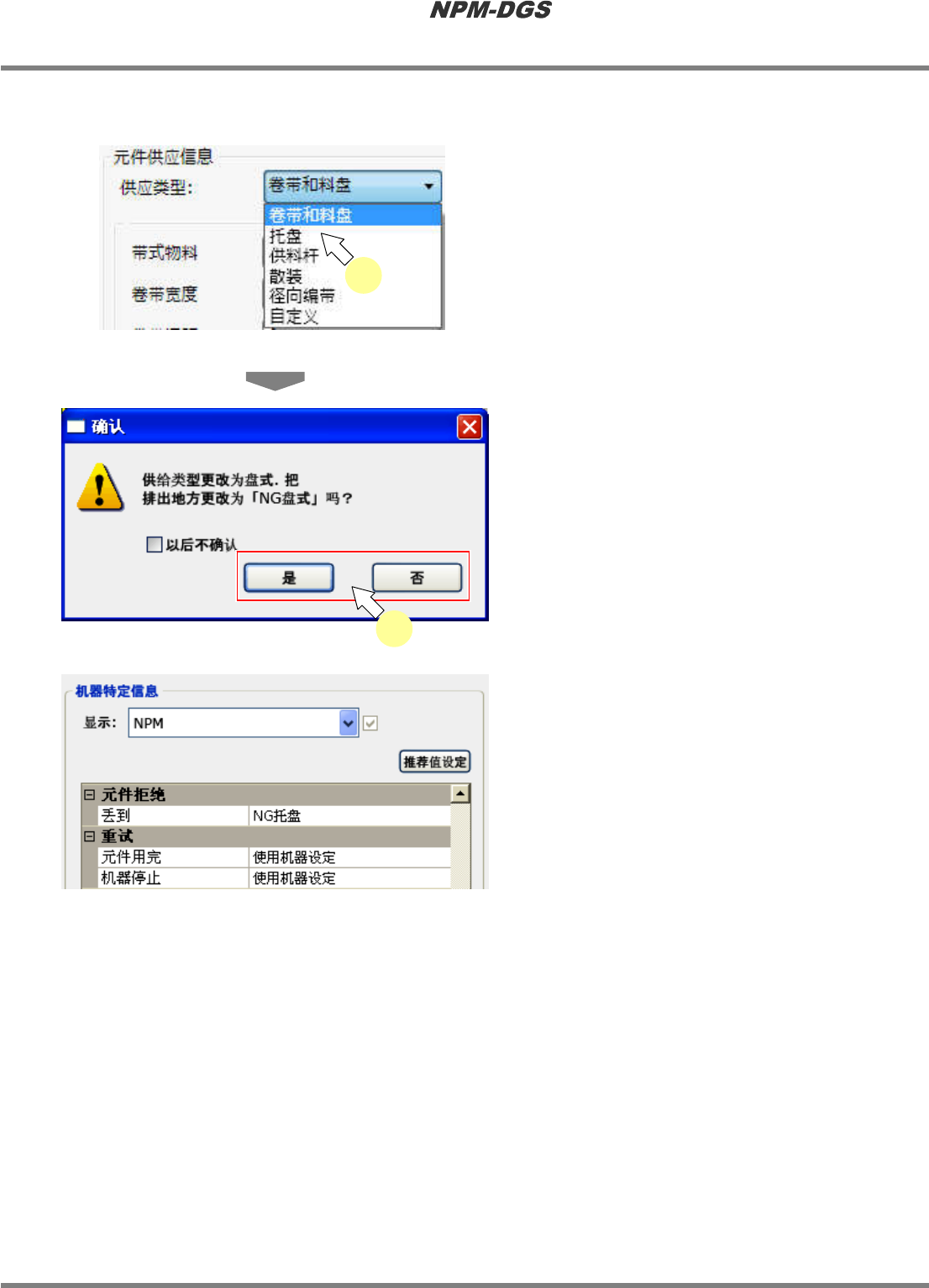 程序手册 6.5 添加新的元件 EJS9AC-MB-06P-18 Page 6-79 n 从供应类型选项中选择 ‘ 托盘 ’ 时的排出地点的设定 1 在 ‘ 元件供应信息 ’ 的 ‘ 供应类型 ’ 选项中 选择 ‘ 托盘 ’ 。 · 显示出将排出地点变更 为 ‘NG 托盘 ’ 的确认对话 框。 2 点击 [ 是 ] / [ 否 ] 。 * [ 是 ] : ‘ 机器特定信息 ’ 的 ‘ 元件拒绝 ’ 的 ‘ 丢到 ’ 将变 为 ‘NG 托…