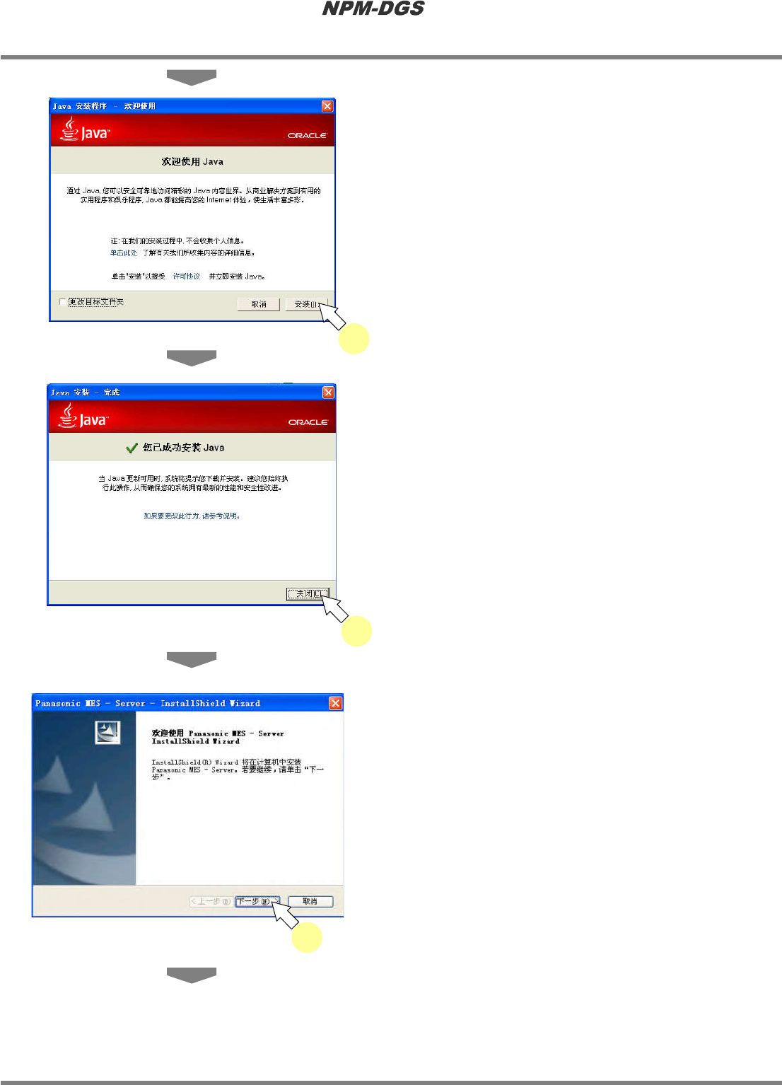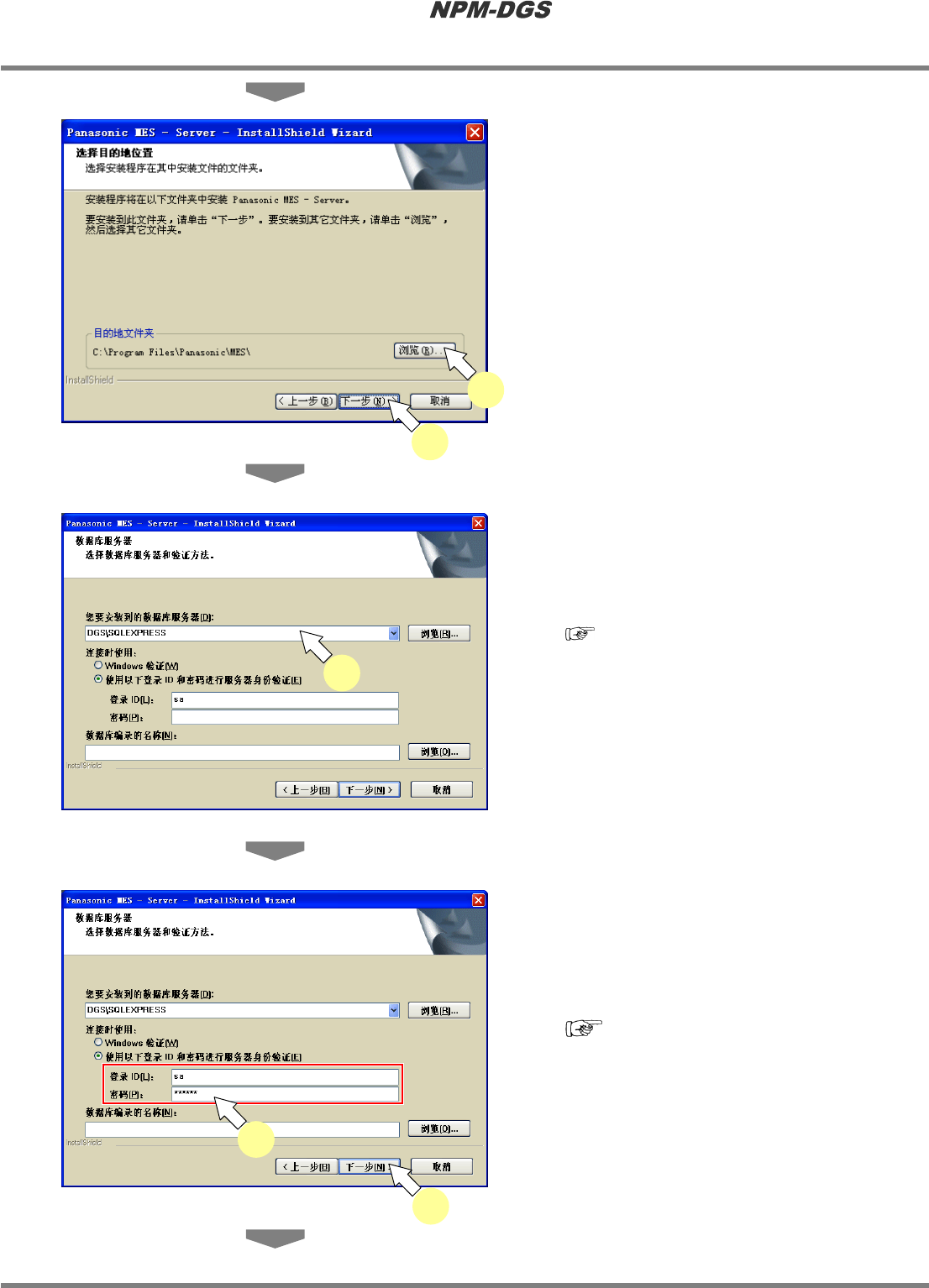 程序手册 2.1 NPM-DGS 的安装 EJS9AC-MB-02P-12 Page 2-41 6 需要变更安装目的地时,点击 [ 浏览 …] 选择文件夹。 * 通常无需变更。 7 点击 [ 下一步 ] 。 8 在 ‘ 您要安装到的数据库服务器 ’ 栏里输 入服务器名。 · 通常输入 ‘ 电脑名 \SQLEXPRESS’ 。 服务器名的确认方法 : ‘2.1.7 NPM-DGS 的安装 ’ ® ‘ n 服务器名 的确认 ’ * 在单机的…