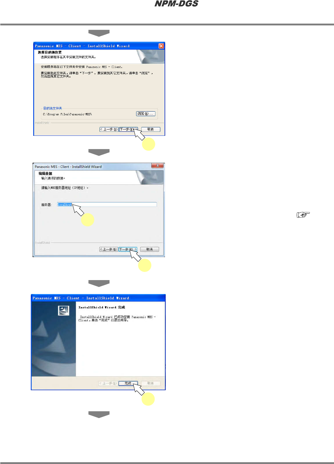 程序手册 2.1 NPM-DGS 的安装 EJS9AC-MB-02P-12 Page 2-43 13 点击 [ 下一步 ] 。 14 在 ‘ 服务器 ’ 中输入 ‘localhost’ 。 15 点击 [ 下一步 ] 。 * 在安装后也可通过更改 工具变更连接处服务 器。关于服务器更改工 具,请参照 ‘13.7 服务器更改工具 ’ 。 16 点击 [ 完成 ] 。 Insta ll020201S-36C01 16 Install0202…