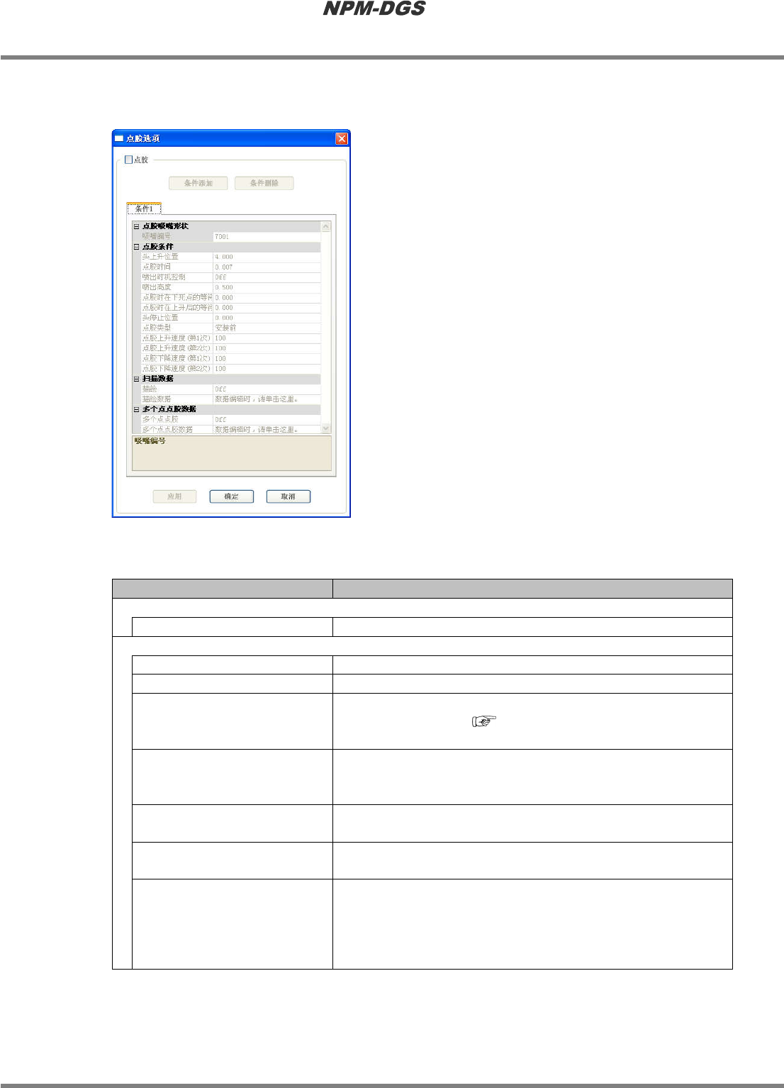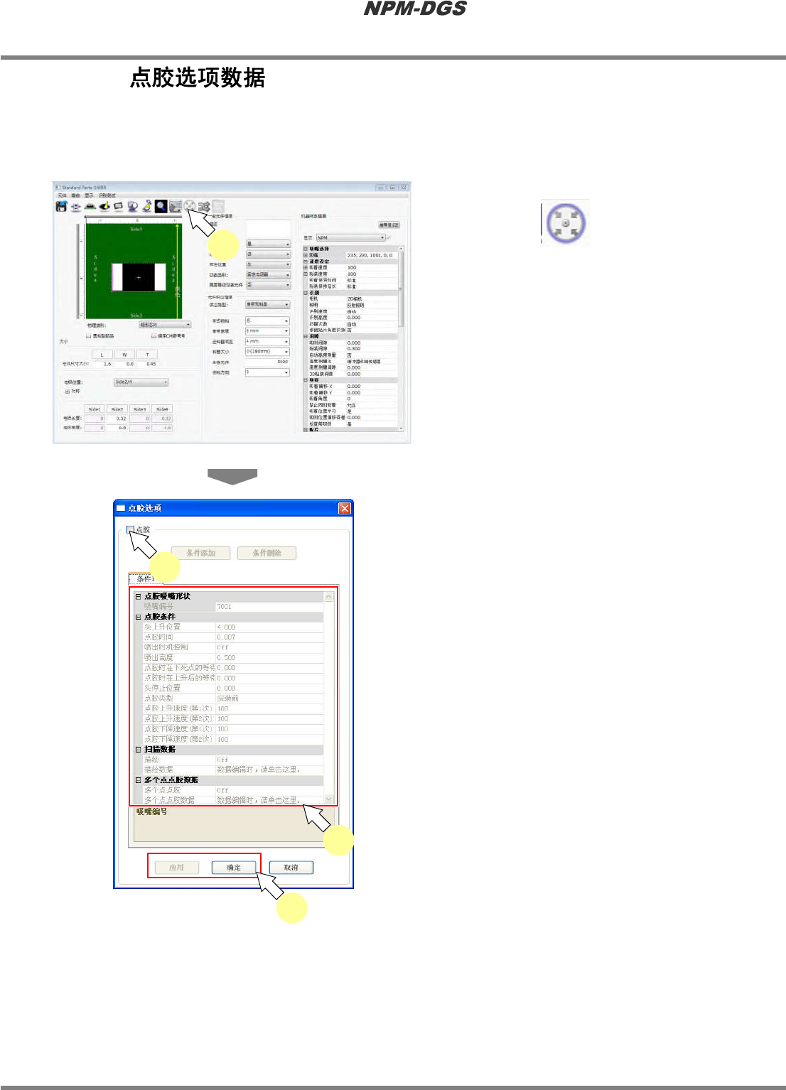 程序手册 6.5 添加新的元件 EJS9AC-MB-06P-18 Page 6-129 6.5.5 对需要进行点胶的元件设定有必要的 点 胶选项。 n 添加新的点胶选项 1 点击菜单栏的 [ 高级 ] ® [ 点胶选项 ] 或工 具栏的 ( 点胶选项 ) 。 · 显示出 < 点胶选项 > 画面。 2 在 ‘ 点胶 ’ 的选框中打勾。 3 设定各种项目。 4 点击 [ 应用 ] 或 [ 确定 ] 。 · 如果点击 [ 确定 ]…