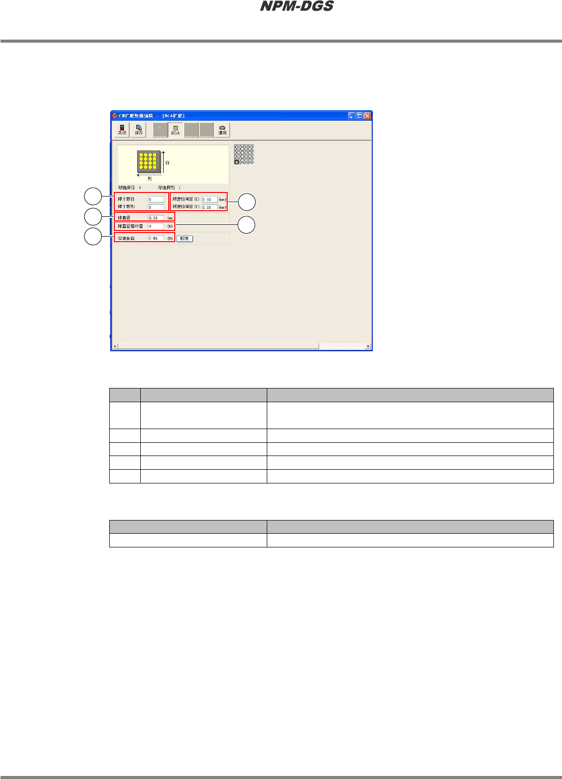 程序手册 6.5 添加新的元件 EJS9AC-MB-06P-18 Page 6-147 n B GA 扩展 当将元件识别参考序号设定为以下的 值 时,将显示 BGA 元件的 CM 扩展数据编辑画面。 元件识别参考序号 : 201 ~ 207 、 237 ~ 240 n 设定项目 No. 名称 说明 1 ‘ 球个数行 ’ ‘ 球个数列 ’ 每行、每列的球配置数量。 2 ‘ 球进给间距 ’ 球之间的间隔。 3 ‘ 球直径 ’ 球的直径。 4…