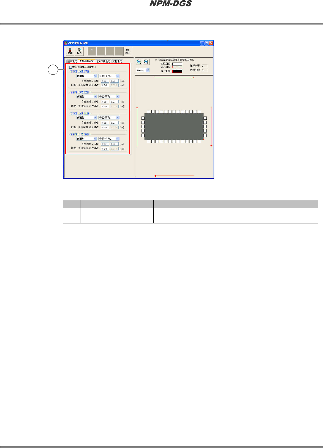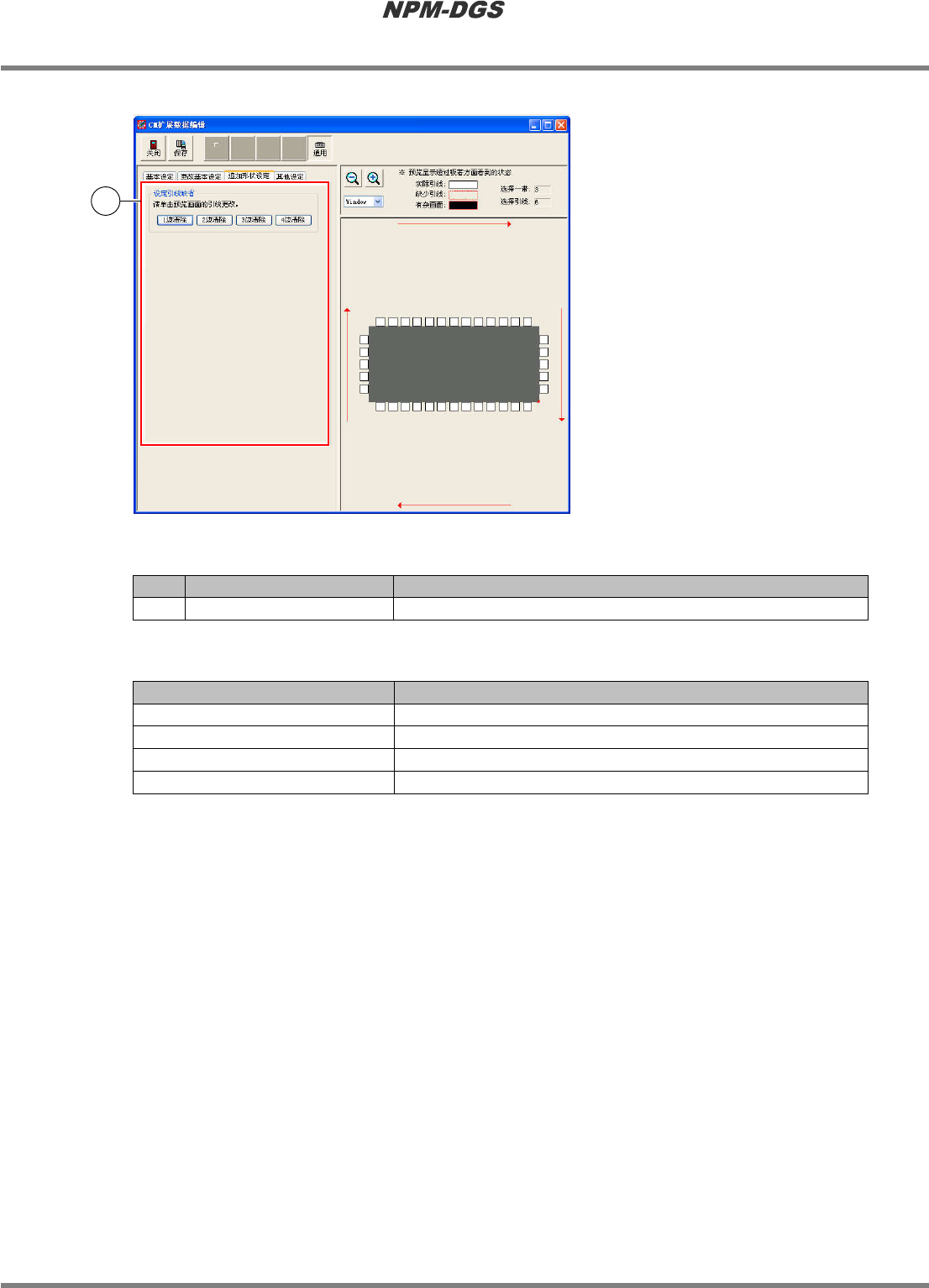 程序手册 6.5 添加新的元件 Page 6-152 EJS9AC-MB-06P-18 n [ 追加形状设定 ] 标签 n 设定项目 No. 名称 说明 1 ‘ 设定引线缺省 ’ 清除每个边的引线缺省 、有噪点的形状。 n 按钮 按钮 说明 [1 边清除 ] 清除下边的引线状态。 [2 边清除 ] 清除左边的引线状态。 [3 边清除 ] 清除上边的引线状态。 [4 边清除 ] 清除右边的引线状态。 Parts0 60506S-12C00…