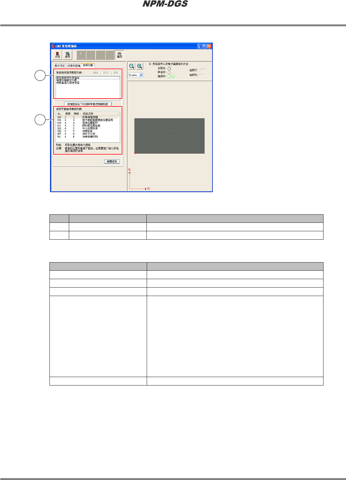 程序手册 6.5 添加新的元件 Page 6-158 EJS9AC-MB-06P-18 n 按下 [ 选项功能列表参照、设定 ] 时的画面 n 设定项目 No. 名称 说明 1 ‘ 登记结束选择机能列表 ’ 一览显示在其他标签设 定的选项,以及追加登录的 选项功能。 2 ‘ 设定可能选项机能列表 ’ 一览显示可设定的选项 。 n 按钮 按钮 说明 [ 编辑 ] 编辑所选择的登录完毕选项的设定值 。 [ 删除 ] 删除所选择的登录完毕的选…