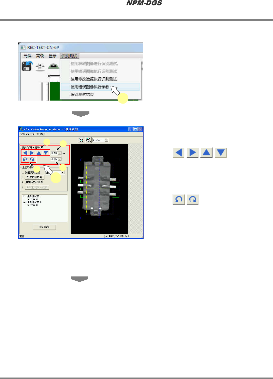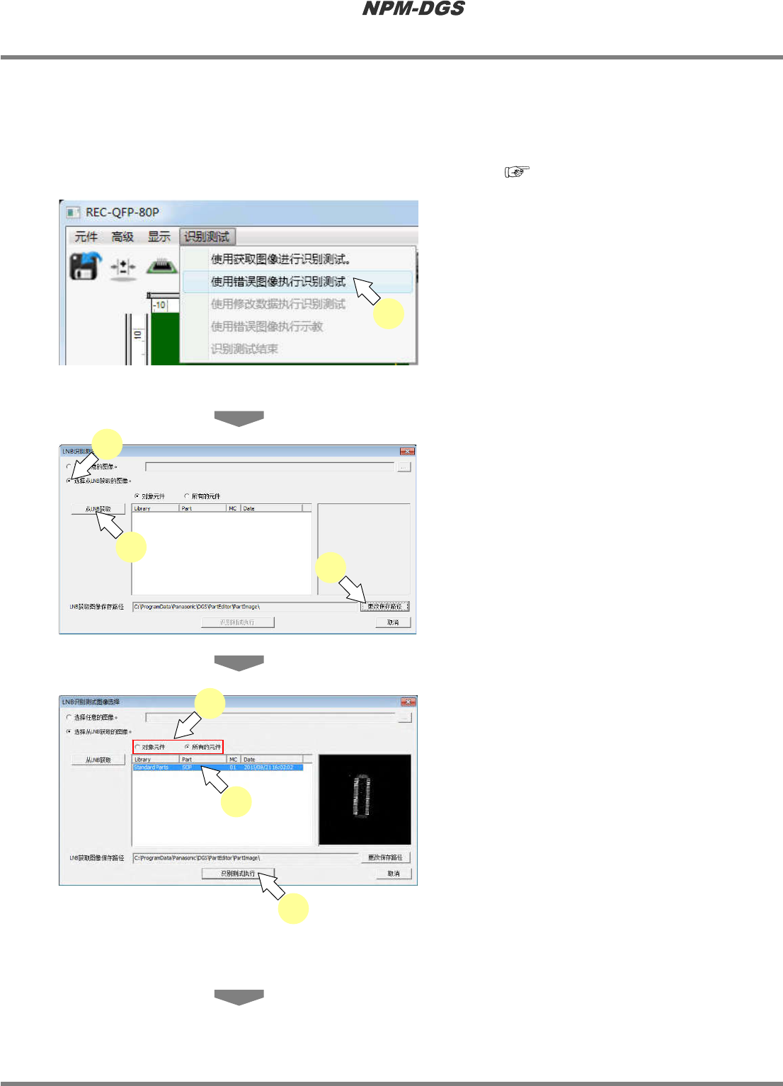 程序手册 6.9 使用设备识别错误图像执行识别测试 Page 6-208 EJS9AC-MB-06P-18 · 显示 < 识别测试 > 画面,并在画面上再现保存进 设备之际所发生的故障 。 * 如果属于识别错误, 将会在 c. ‘ 识别结果 ’ 中显示 错误的原因和对策。 * 点击 d.[ 显示错误信息 ] ,即会显示错误图像。 * 之后的操作步骤与■ 修改数据时的识别测试 ( 选择任意图像时 ) 相同。 Parts0 60…