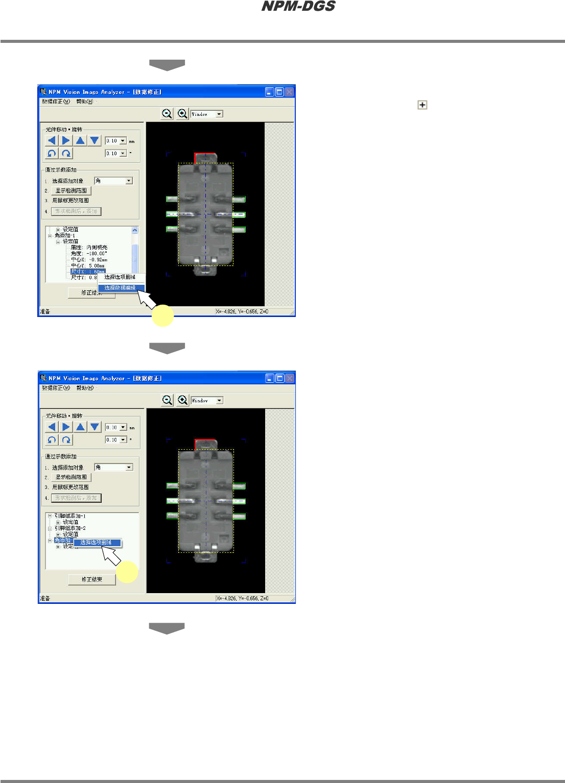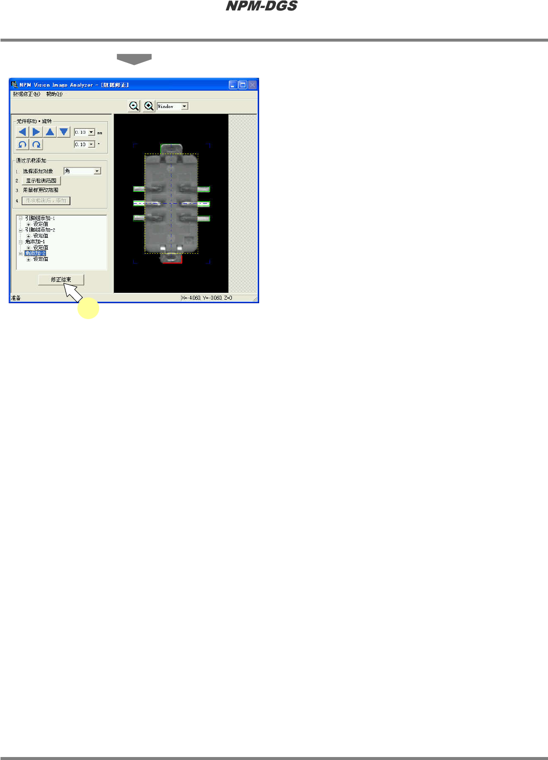 程序手册 6.9 使用设备识别错误图像执行识别测试 Page 6-214 EJS9AC-MB-06P-18 10 完成了需要添加的形状后,或者点击 [ 修正结束 ] ,或者选择菜单栏的 [ 修正数 据 ] ® [ 结束 ] ,结束使用图像所进行的 识别示教操作。 · < 数据修正 > 画面关闭, 并再次显示 < 识别测试 > 画面。 · 所修正的数据即会反映 进元件编辑器。 Parts0 60901S-21C00…