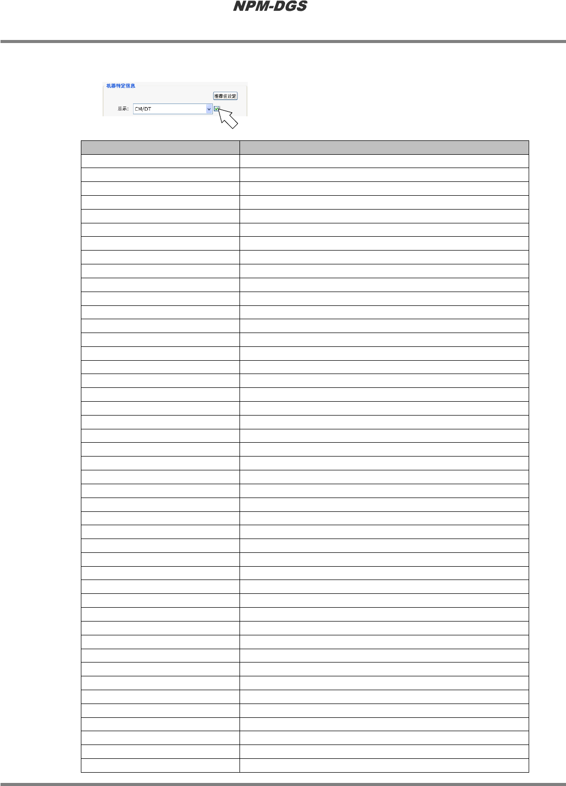 程序手册 6.10 导出 CSV EJS9AC-MB-06P-18 Page 6-219 项目 说明 ‘ 元件用完次数 ’ 显示元件用完停止时的重试次数。 ‘ 吸着错误次数 ’ 显示吸着停止时的重试次数。 ‘ 拼接位置吸着位置示教 ’ 显示在拼接时是否对吸着位置进行自 动 示教。 ‘ 倾斜范围检查 ’ 显示倾斜范围检查值。 ‘ 中心范围检查 ’ 显示中心范围检查值。 ‘ 亮度检查数 ’ 显示亮度检查数。 ‘ 元件周围附着物检查 ’ 显示…