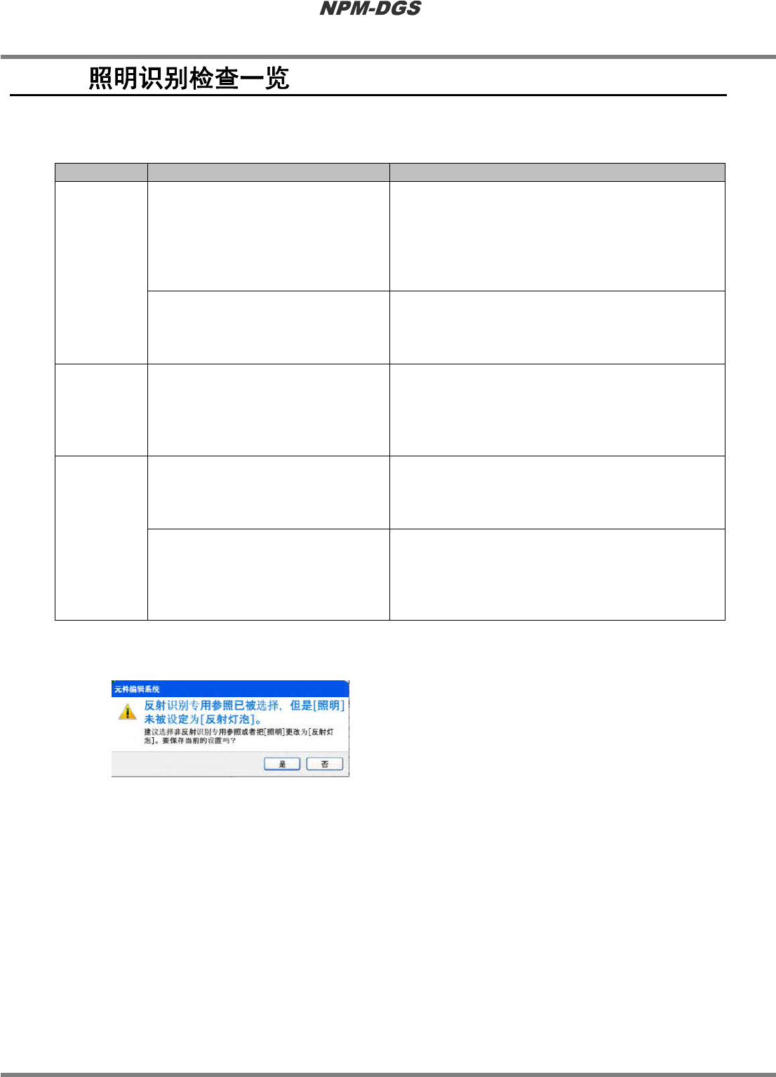 在元件编辑器下,当以不符合照明模式的设定保存时,将显示警告信息。当显示警告信息时,虽然