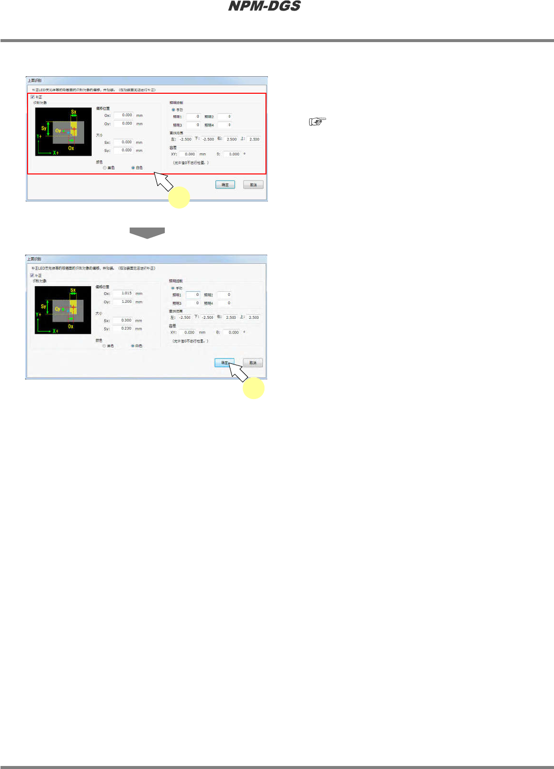 程序手册 6.12 头照相机识别选项 EJS9AC-MB-06P-18 Page 6-229 6.12.3 对 LED 元件等所拥有的萤光体执行 头照相机识别后进行吸着,由此可通过补正使 萤光体 的中心转 为贴装位置。 n 设定项目 No. 名称 说明 1. ‘ 补正 ’ 对元件进行 ‘ 上面识别 ’ 的设定。 * 无需设定时,请不要勾选复选框。默 认值为 ‘ 勾选 ’ 状态。 2. ‘ 识别对象 ’ ‘Ox’ 萤光体的 X 坐标偏移量…