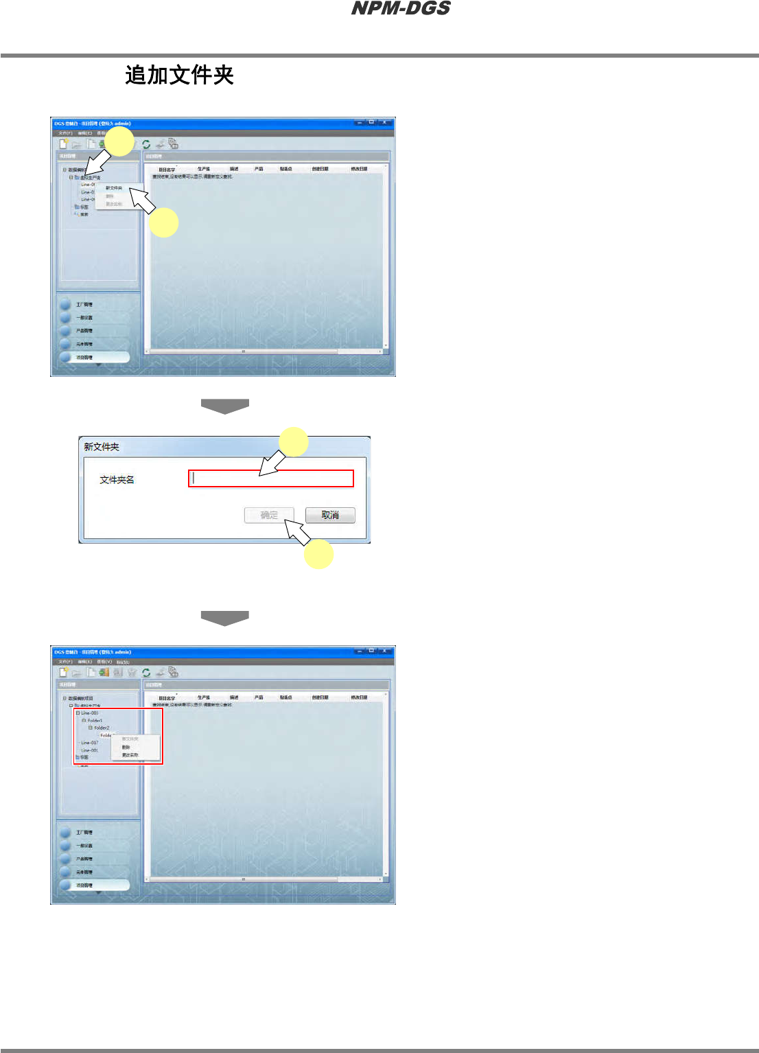 程序手册 7.1 概要 EJS9AC-MB-07P-20 Page 7-5 7.1.2 1 选择生产线名。 2 从右击菜单上选择 [ 新文件夹 ] 。 · 显示出 < 新文件夹 > 画面。 3 输入新文件夹名。 * 可最多输入 64 个文字 ( 不包含以下的特殊文字 ) % , ” 空格 \ : ; / . < > ? * | 全角文字 4 点击 [ 确定 ] 。 · 将在所选择场所的下方 创建文件夹。 * 不可…