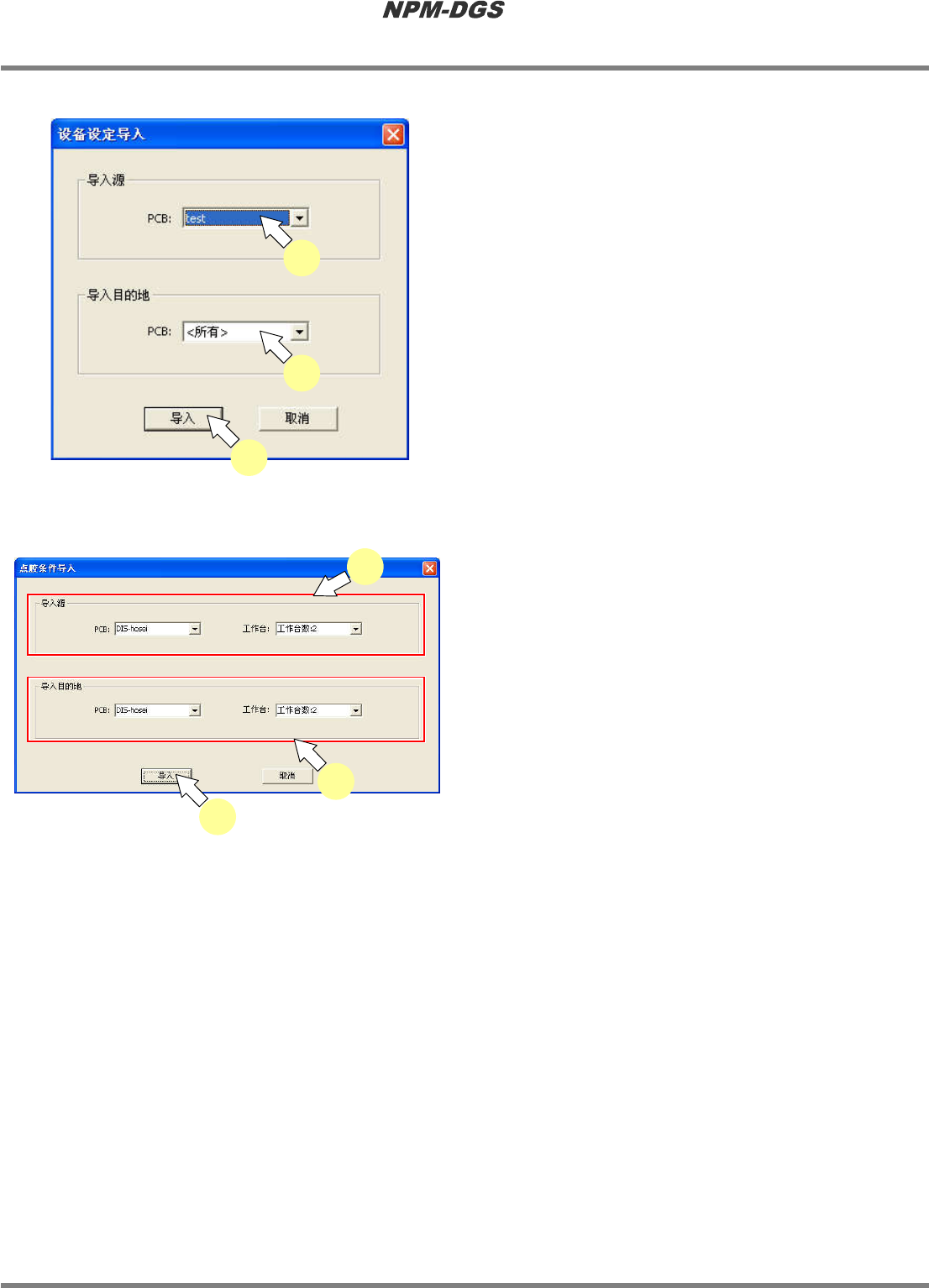 程序手册 7.2 项目编辑系统主画面 Page 7-82 EJS9AC-MB-07P-20 n 设备设定导入 1 指定导入源的 PCB 。 2 指定导入目的地的 PCB 。 3 点击 [ 导入 ] 。 n 点胶条件导入 1 指定点胶源 PCB 、工作台。 2 指定导入目的地 PCB 、工作台。 3 点击 [ 导入 ] 。 Project070207S-04C 00 3 1 2 Project070207S-05C00 3 1 2
