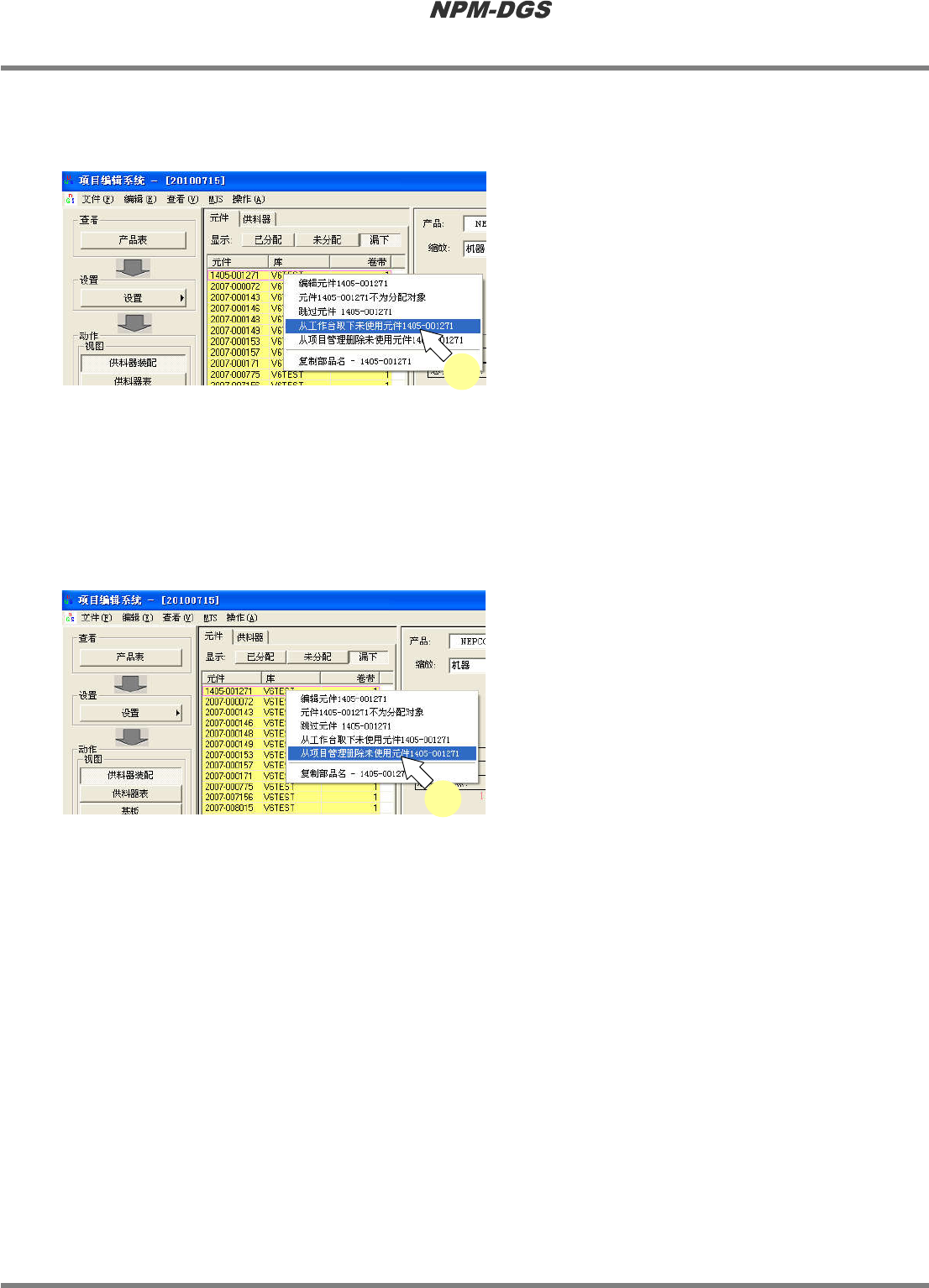 使用这项功能,能够将配置在供料器上的全部未使用元件都从供料器上取下来,并从项目管理的一