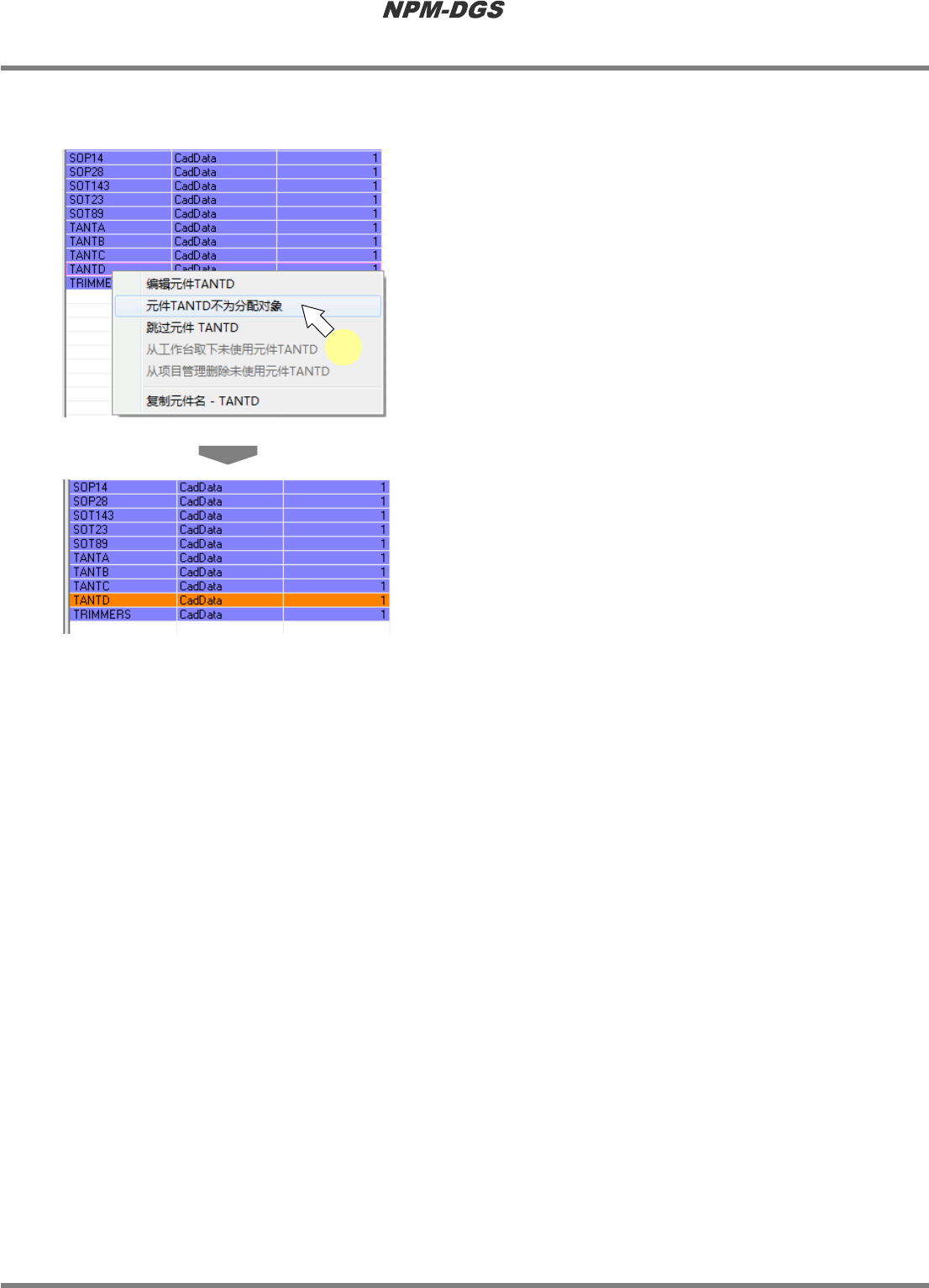 程序手册 7.4 供料器装配画面 Page 7-116 EJS9AC-MB-07P-20 n 元件的分配对象外设定 1 在未配置的元件上右击。 2 选择右击菜单的 [ 元件 XXXX 不为分配 对象 ] 。 · 元件的背景颜色转为橘 黄色 ( 分配对象外 ) 。 Product070300S-26C01 Product070300S-25C01 2
