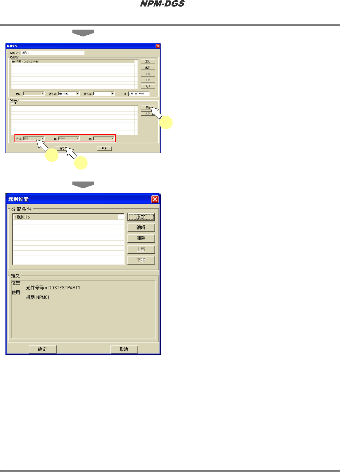 程序手册 7.8 装配规则画面 Page 7-170 EJS9AC-MB-07P-20 6 点击 [ 添加 ] 。 · 在分配要求列表中将会 添加新的分配要求。 7 设定 ‘ 种类 ’ 、 ‘ 值 ’ 、 ‘ 表 ’ ,然后设定分配 要求。 * 若要再添加分配要求, 请反复进行步骤 6. 和 7. 的操作。 8 点击 [ 确定 ] 。 · 将会保存设定, 并在 ‘ 分配条件 ’ 框内显示分配要 求。 Product070700S-0 7…