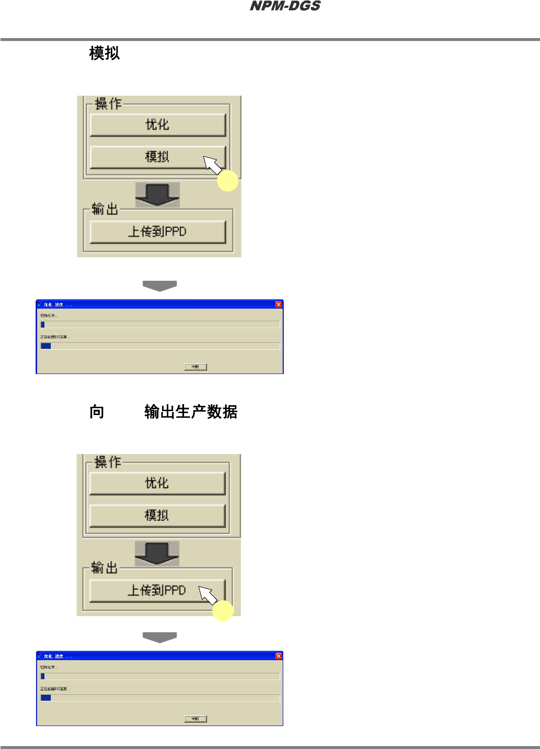 程序手册 9.6 生成数据 Page 9-122 EJS9AC-MB-09P-14 9.6 9.6.1 1 在项目栏的 ‘ 动作 ’ 的 ‘ 操作 ’ 中选择 [ 优 化 ] ,或者在菜单栏中选择 [ 操作 ] ® [ 最 优化 ] 。 · 将会显示优化的进度画 面。 · 优化完成后, 将会自动切换到供料器装配画面, 并显示优化结果。 PPD090701S-0 2C00 PPD090701S-01C00 1 PPD090701S-0 3…