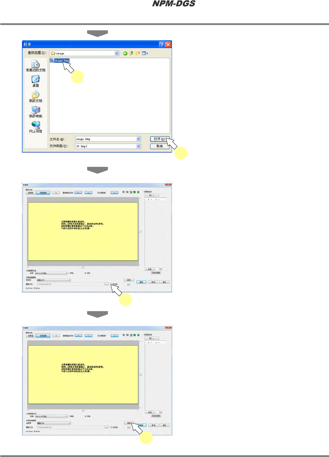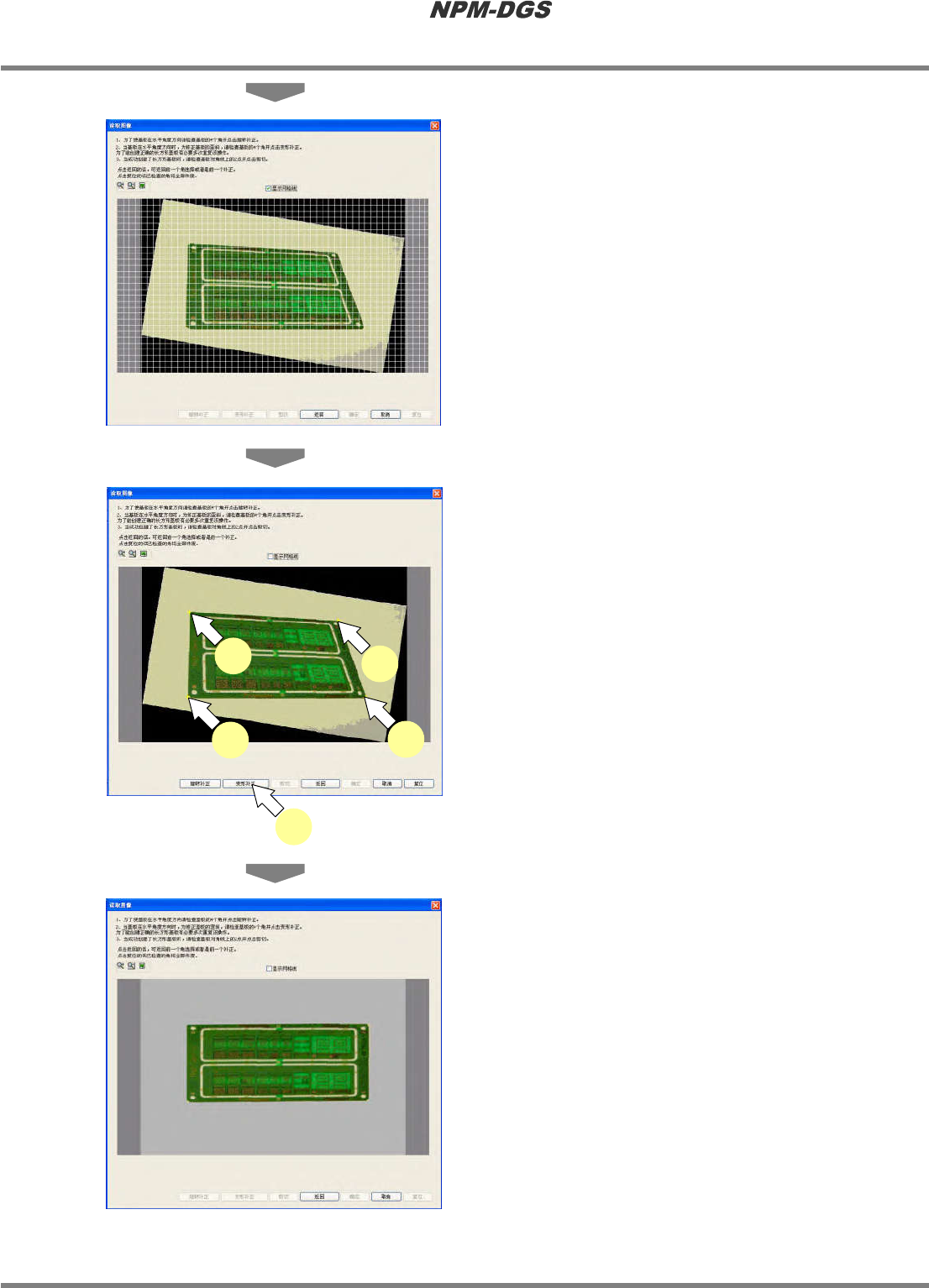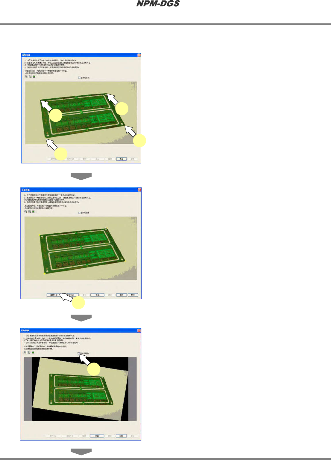 程序手册 13.2 支撑销配置数据的编制功能 Page 13-24 EJS9AC-MB-13P-19 ② 图像文件的补正 * 如果属于无需补正的图 像,则无需本项操作。 1 点击基板的四个角。 · 在点击的部位上将会显 示 + 字标记。 2 点击 [ 旋转补正 ] 。 · 将进行图像的旋转补正 。 * 旋转大的图像,需要进 行数次补正。 3 勾选 ‘ 显示网格线 ’ 。 Howto130205S-39C00 2 Howto13020…