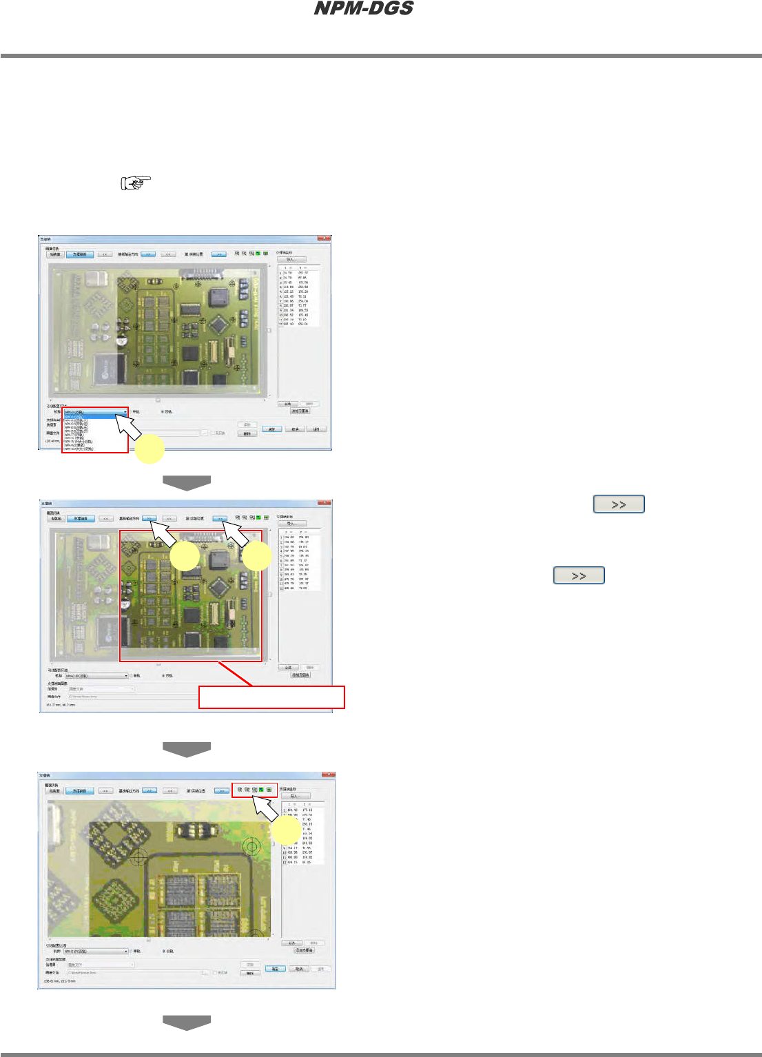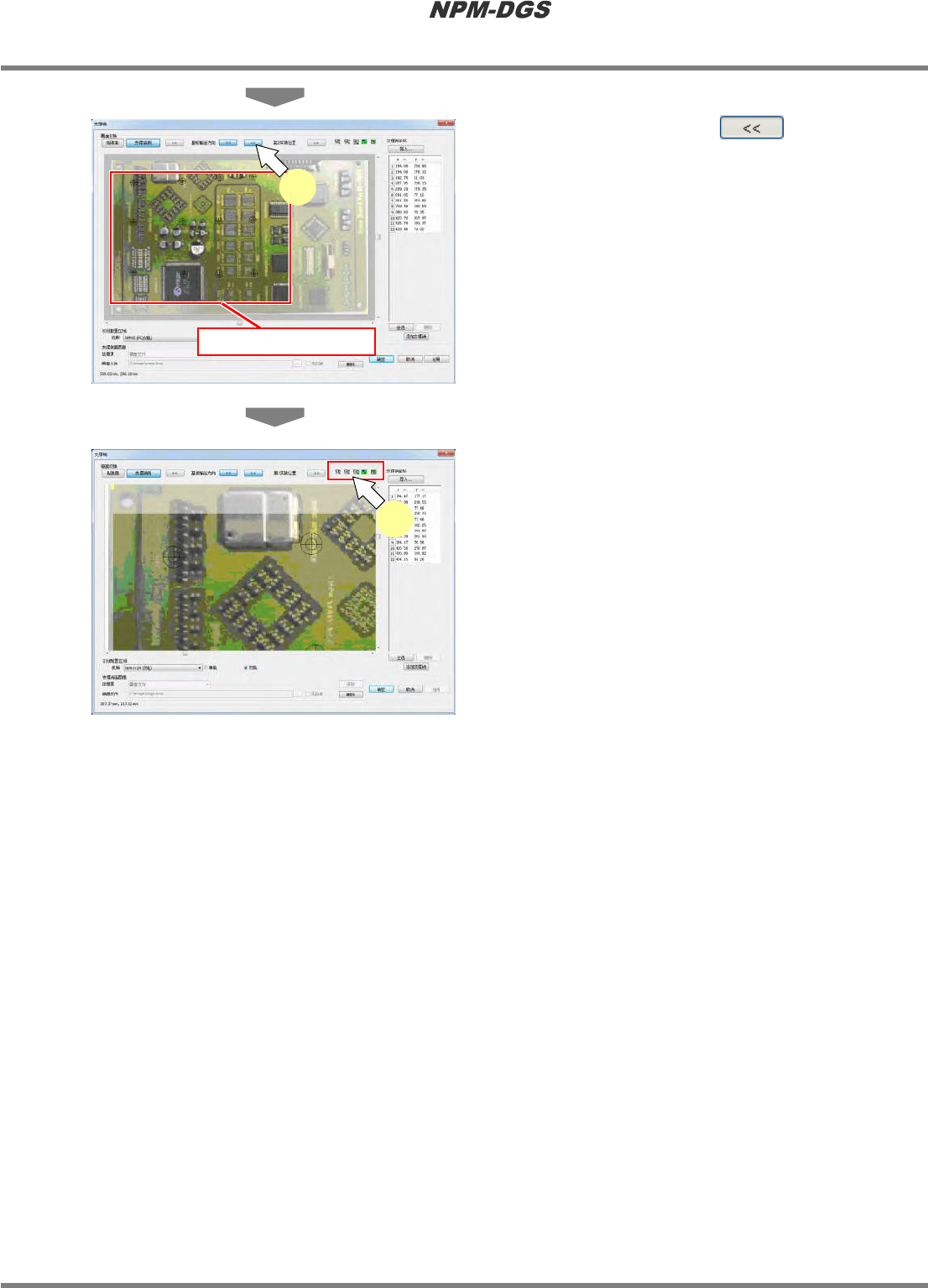 程序手册 13.2 支撑销配置数据的编制功能 EJS9AC-MB-13P-19 Page 13 -45 5 点击分割贴装的 。 * 将切换到第 2 贴装位置,并显示基板被搬送到 这个位置时的支撑销配置状况。 * 即使切换了分割贴装位置,支撑销坐 标 的值也 相同。 6 通过放大图标放大 PCB 示意图后,确 认配置区域内的支撑销位置。 Howto130205S-15C02 第 2 贴装位置 5 Howto130205S-20C01 6
