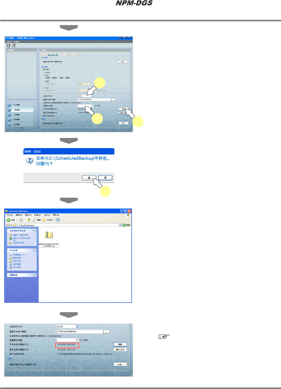 程序手册 3.2 关于环境设定画面 Page 3-16 EJS9AC-MB-03P-11 4 设定 ‘ 备份执行时间 ’ 、 ‘ 保留的备份数 ’ 后,点击 [ 刷新 ] 。 5 如果没有成功编制所设定的文件夹, 将 会显示确认对话框,这时点击 [ 是 ] 。 · 当所指定的备份日期到 来时,即会自动实施备 份并保存文件。 * 在没有打开电脑电源的 情形下,不会实施自动 备份。 · 即会更新下一次备份的 日期,并将备份信息登 录进自动备…