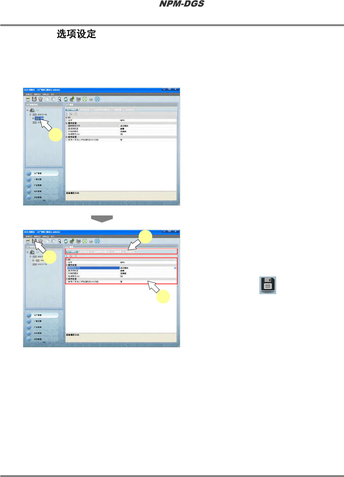 程序手册 4.3 假想生产线的构筑 EJS9AC-MB-04P-21 Page 4-13 4.3.3 在选项设定画面中进行生产线、设备 所 使用的选项、参数、数据编制 工 作的默认设定的定义。 n 生产线参数设定的确认、编辑 设定与生产线相关的参数。 1 选择画面左上方树形菜单里要设定的 生产线。 · 将在工厂管理区域内显 示各个设定项目。 2 选择设定项目的选项。 3 编辑项目。 4 点击工具栏的 ( 保存 ) 。 · 保存新的设定。…